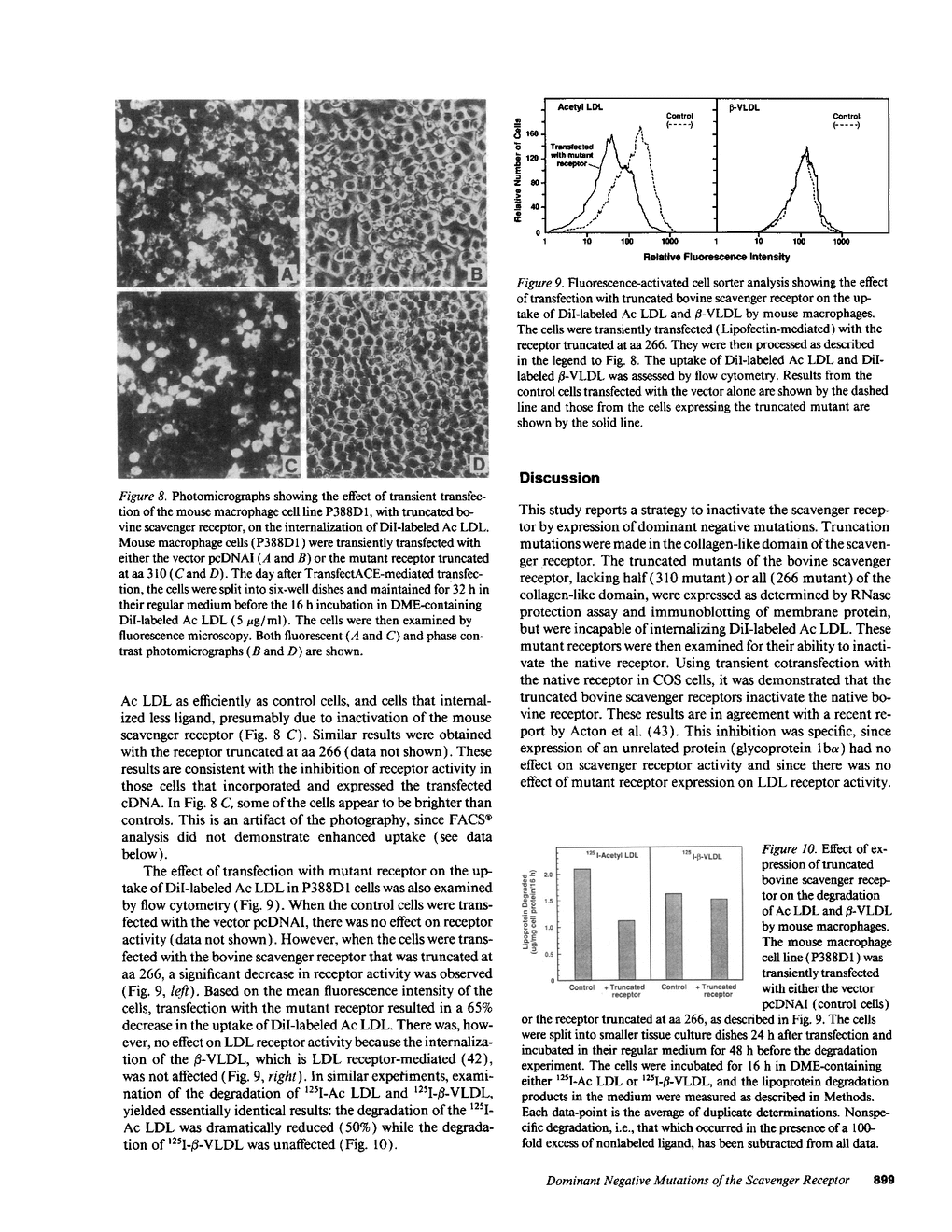 The bovine scavenger receptor was truncated at amino acid 266 or 310 to delete either all or part, respectively, of the collagen-like domain. The truncated receptors were inactive in the binding and internalization of acetyl (Ac) low density lipoprotein (LDL). Coexpression of truncated receptor with the native receptor dramatically reduced the percentage of cells internalizing fluorescently labeled Ac LDL, compared with cells expressing the native receptor alone. The mutant truncated at amino acid 266 was most effective in receptor inactivation, resulting in a 42% or 80% decrease in the percentage of cells expressing active receptor when transfected in a 1:1 or 1:2 molar ratio (native:mutant), respectively, with native receptor. Degradation of 125I-Ac LDL was reduced up to 90% when the native and truncated mutant receptors were coexpressed. Scavenger receptor inhibition was specific because the activity of the LDL receptor was not altered. Transient transfection of the mouse macrophage cell line P388D1 with truncated scavenger receptor resulted in a 65% decrease in the uptake and degradation of Ac LDL but did not decrease the degradation of beta-migrating very low density lipoprotein, which is LDL receptor-mediated. These results demonstrate that expression of truncated bovine scavenger receptor inactivates both the native bovine and murine scavenger receptors, producing a dominant negative phenotype in vitro.