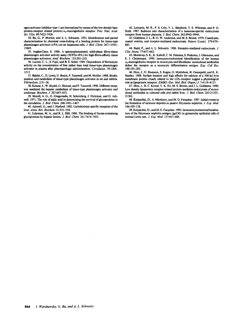 Tissue-type plasminogen activator (t-PA) is a plasma serine protease that catalyzes the initial and rate-limiting step in the fibrinolytic cascade. t-PA is widely used as a thrombolytic agent in the treatment of acute myocardial infarction. However, its use has been impaired by its rapid hepatic clearance from the circulation following intravenous administration. Studies with both rat hepatoma MH1C1 cells (G. Bu, S. Williams, D. K. Strickland, and A. L. Schwartz, 1992. Proc. Natl. Acad. Sci. USA. 89:7427-7431) and human hepatoma HepG2 cells (G. Bu, E. A. Maksymovitch, and A. L. Schwartz. 1993. J. Biol. Chem. 28:13002-13009) have shown that binding of t-PA to its clearance receptor, the low density lipoprotein receptor-related protein/alpha 2-macroglobulin receptor, is inhibited by a 39-kD protein that copurifies with this receptor. Herein we investigated whether administration of purified recombinant 39-kD protein would alter t-PA clearance in vivo. We found that intravenous administration of purified 39-kD protein to rats prolonged the plasma half-life of 125I-t-PA from 1 min to approximately 5-6 min. The plasma half-life of t-PA enzymatic activity was similarly prolonged following intravenous administration of purified 39-kD protein. In addition we found that the 39-kD protein itself was rapidly cleared from the circulation in vivo. Clearance of 125I-39-kD protein was a biphasic process with half-lives of 30 s and 9 min and the liver was the primary organ of clearance. Preadministration of excess unlabeled 39-kD protein slowed 125I-39-kD protein clearance in rats in a dose-dependent manner, suggesting that specific clearance receptors were responsible for this process. Administration of increasing doses of unlabeled 39-kD protein along with labeled 39-kD protein resulted in a decrease in the amount of labeled 39-kD protein associating with the liver and a concomitant increase in the amount of labeled 39-kD protein associating with the kidneys, indicating two clearance mechanisms exist for the 39-kD protein.