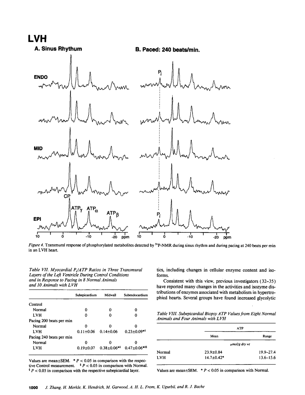 Transmurally localized 31P-nuclear magnetic resonance spectroscopy (NMR) was used to study the effect of severe pressure overload left ventricular hypertrophy (LVH) on myocardial high energy phosphate content. Studies were performed on 8 normal dogs and 12 dogs with severe left ventricular hypertrophy produced by banding the ascending aorta at 8 wk of age. Spatially localized 31P-NMR spectroscopy provided measurements of the transmural distribution of myocardial ATP, phosphocreatine (CP), and inorganic phosphate (Pi); spectra were calibrated from measurements of ATP content in myocardial biopsies using HPLC. Blood flow was measured with microspheres. In hypertrophied hearts during basal conditions, ATP was decreased by 42%, CP by 58%, and the CP/ATP ratio by 32% in comparison with normal. Increasing myocardial blood flow with adenosine did not correct these abnormalities, indicating that they were not the result of persistent hypoperfusion. Atrial pacing at 200 and 240 beats per min caused no change in high energy phosphate content in normal hearts but resulted in further CP depletion with Pi accumulation in the inner left ventricular layers of the hypertrophied hearts. These changes were correlated with redistribution of blood flow away from the subendocardium in LVH hearts. These findings demonstrate that high energy phosphate levels and the CP/ATP ratio are significantly decreased in severe LVH. These abnormalities are proportional to the degree of hypertrophy but are not the result of persistent abnormalities of myocardial perfusion. In contrast, depletion of CP and accumulation of Pi during tachycardia in LVH are closely related to the pacing-induced perfusion abnormalities and likely reflect subendocardial ischemia.