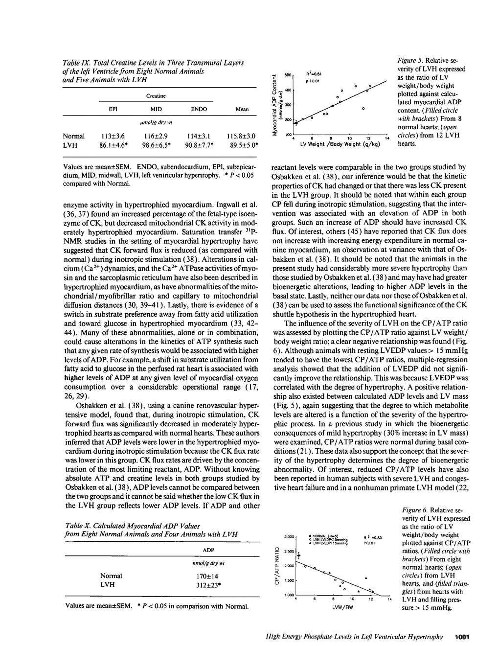Transmurally localized 31P-nuclear magnetic resonance spectroscopy (NMR) was used to study the effect of severe pressure overload left ventricular hypertrophy (LVH) on myocardial high energy phosphate content. Studies were performed on 8 normal dogs and 12 dogs with severe left ventricular hypertrophy produced by banding the ascending aorta at 8 wk of age. Spatially localized 31P-NMR spectroscopy provided measurements of the transmural distribution of myocardial ATP, phosphocreatine (CP), and inorganic phosphate (Pi); spectra were calibrated from measurements of ATP content in myocardial biopsies using HPLC. Blood flow was measured with microspheres. In hypertrophied hearts during basal conditions, ATP was decreased by 42%, CP by 58%, and the CP/ATP ratio by 32% in comparison with normal. Increasing myocardial blood flow with adenosine did not correct these abnormalities, indicating that they were not the result of persistent hypoperfusion. Atrial pacing at 200 and 240 beats per min caused no change in high energy phosphate content in normal hearts but resulted in further CP depletion with Pi accumulation in the inner left ventricular layers of the hypertrophied hearts. These changes were correlated with redistribution of blood flow away from the subendocardium in LVH hearts. These findings demonstrate that high energy phosphate levels and the CP/ATP ratio are significantly decreased in severe LVH. These abnormalities are proportional to the degree of hypertrophy but are not the result of persistent abnormalities of myocardial perfusion. In contrast, depletion of CP and accumulation of Pi during tachycardia in LVH are closely related to the pacing-induced perfusion abnormalities and likely reflect subendocardial ischemia.