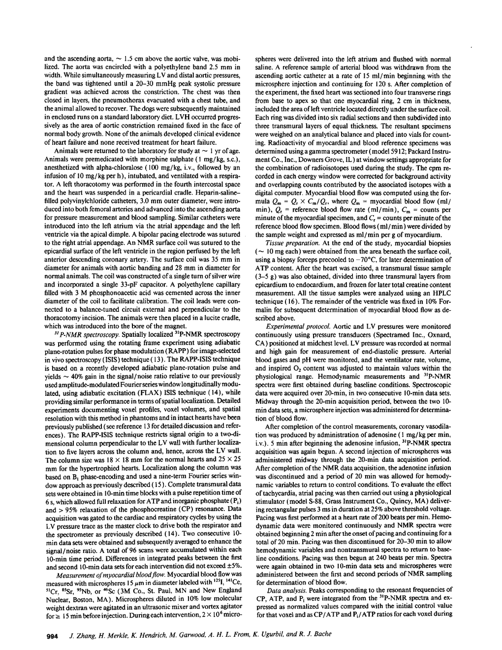 Transmurally localized 31P-nuclear magnetic resonance spectroscopy (NMR) was used to study the effect of severe pressure overload left ventricular hypertrophy (LVH) on myocardial high energy phosphate content. Studies were performed on 8 normal dogs and 12 dogs with severe left ventricular hypertrophy produced by banding the ascending aorta at 8 wk of age. Spatially localized 31P-NMR spectroscopy provided measurements of the transmural distribution of myocardial ATP, phosphocreatine (CP), and inorganic phosphate (Pi); spectra were calibrated from measurements of ATP content in myocardial biopsies using HPLC. Blood flow was measured with microspheres. In hypertrophied hearts during basal conditions, ATP was decreased by 42%, CP by 58%, and the CP/ATP ratio by 32% in comparison with normal. Increasing myocardial blood flow with adenosine did not correct these abnormalities, indicating that they were not the result of persistent hypoperfusion. Atrial pacing at 200 and 240 beats per min caused no change in high energy phosphate content in normal hearts but resulted in further CP depletion with Pi accumulation in the inner left ventricular layers of the hypertrophied hearts. These changes were correlated with redistribution of blood flow away from the subendocardium in LVH hearts. These findings demonstrate that high energy phosphate levels and the CP/ATP ratio are significantly decreased in severe LVH. These abnormalities are proportional to the degree of hypertrophy but are not the result of persistent abnormalities of myocardial perfusion. In contrast, depletion of CP and accumulation of Pi during tachycardia in LVH are closely related to the pacing-induced perfusion abnormalities and likely reflect subendocardial ischemia.