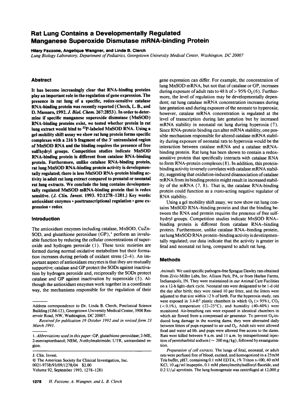 It has become increasingly clear that RNA-binding proteins play an important role in the regulation of gene expression. The presence in rat lung of a specific, redox-sensitive catalase RNA-binding protein was recently reported (Clerch, L. B., and D. Massaro, 1992. J. Biol. Chem. 267:2853). In order to determine if specific manganese superoxide dismutase (MnSOD) RNA-binding proteins exist, we tested whether protein in rat lung extract would bind to 32P-labeled MnSOD RNA. Using a gel mobility shift assay we show rat lung protein forms specific complexes with a 216 b fragment of the 3' untranslated region of MnSOD RNA and the binding requires the presence of free sulfhydryl groups. Competition studies indicate MnSOD RNA-binding protein is different from catalase RNA-binding protein. Furthermore, unlike catalase RNA-binding protein, rat lung MnSOD RNA-binding protein activity is developmentally regulated; there is less MnSOD RNA-protein binding activity in adult rat lung extract compared to prenatal or neonatal rat lung extracts. We conclude the lung contains developmentally regulated MnSOD mRNA-binding protein that is redox sensitive.