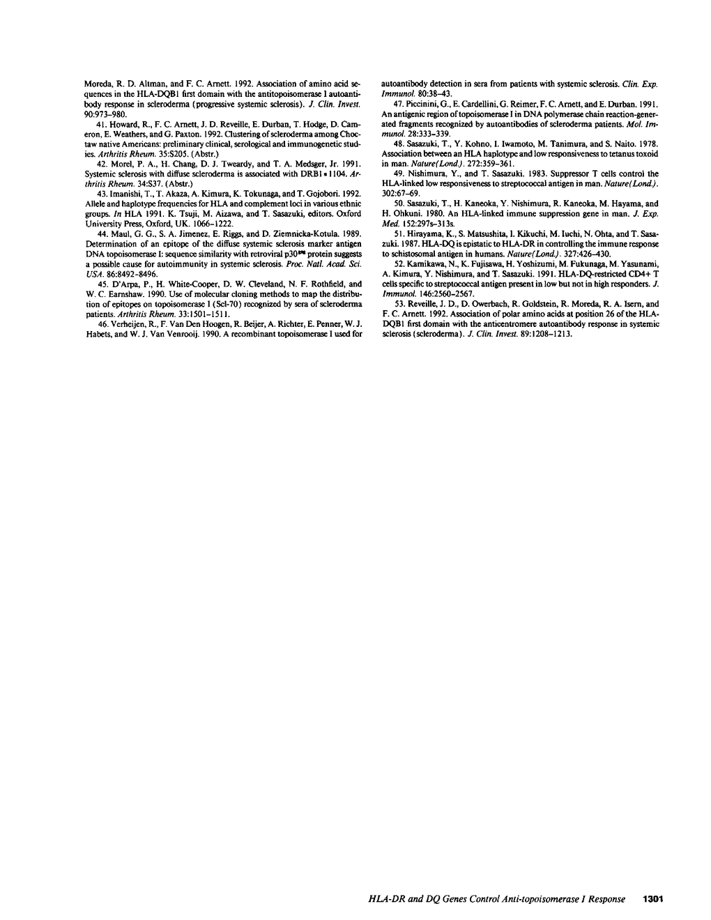 HLA class II alleles were determined using the PCR-RFLP method in Japanese systemic sclerosis (scleroderma) patients with (n = 28) or without (n = 34) anti-topoisomerase I antibodies (anti-topo I). Either the DQB1*0601 or *0301 allele was recognized in all anti-topo I positive patients, compared with 44% of anti-topo I negative patients (P < 0.00001, relative risk [RR] > 41) or 58% of Japanese healthy control subjects (P < 0.00001, RR > 24). Tyrosine at position 26 in the second hypervariable region in the beta 1 domain of the DQB1 gene is common to these two alleles and is not present in any other known DQB1 alleles. We also examined immunoreactivities of anti-topo I positive sera to four different autoantigenic B cell epitopes of topo I molecule that were expressed as recombinant fusion proteins. One major B cell epitope, located within the region corresponding to amino acid residues 74-248, was perfectly associated with the amino acid sequence FLEDR at positions 67-71 in the beta 1 domain of the DRB gene. Two other epitopes, corresponding to 316-441 or 658-700, were associated with the serologically defined HLA-DR52 antigen. Patients with both FLEDR and DR52 demonstrated higher anti-topo I antibody titers. These results suggest that the HLA-DR and DQ genes together control the autoimmune response to topo I in systemic sclerosis.