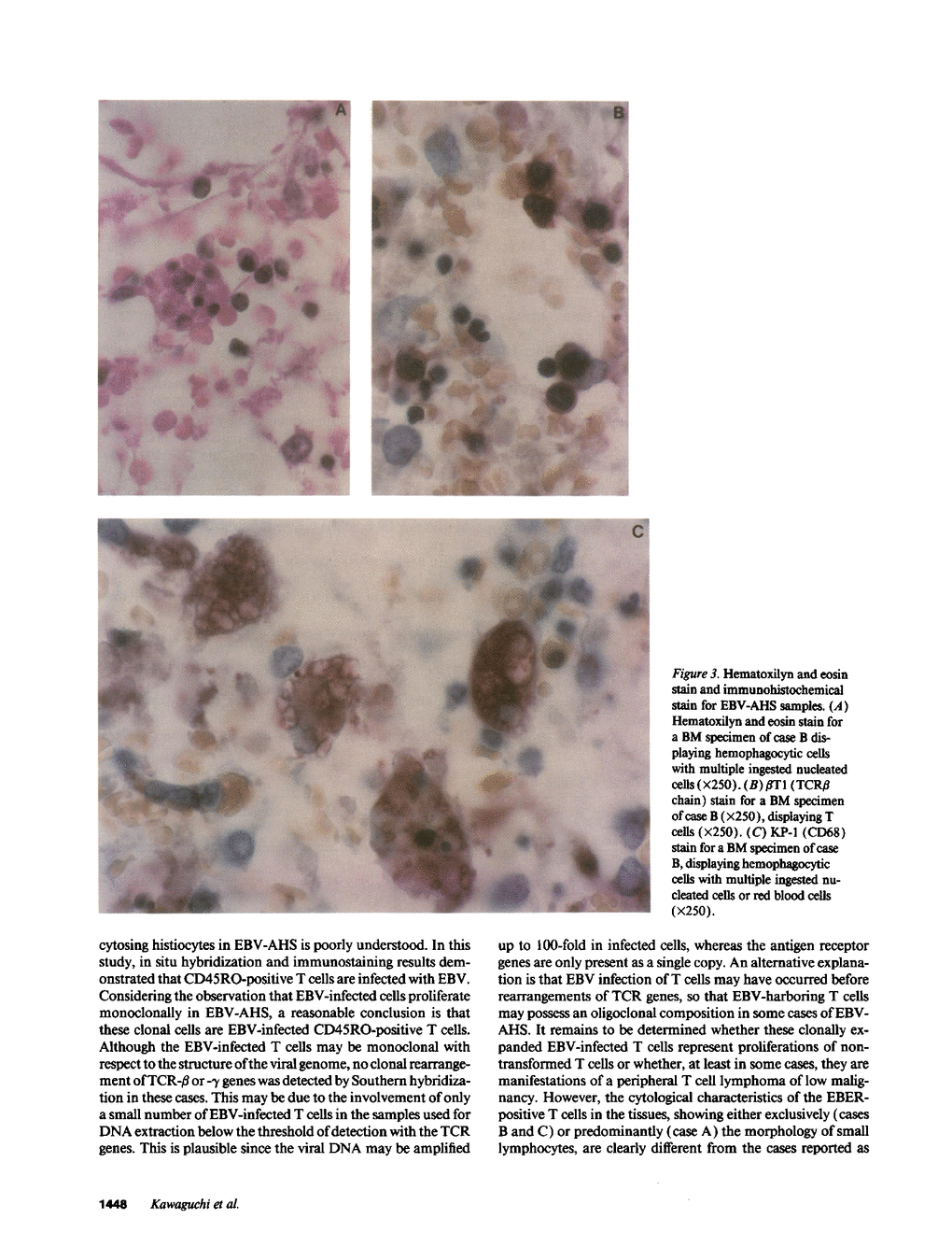 The clonal composition of EBV-infected cells was examined in three cases of EBV-associated hemophagocytic syndrome by analysis of the heterogeneity of terminal repetitive sequences in the EBV genome, indicating monoclonal expansion of EBV-infected cells in all cases. Involvement of T lymphoid cells was determined by in situ hybridization using 35S-labeled RNA probes specific for the small EBV-encoded nuclear RNAs, EBER1 and EBER2, in combination with immunostaining for the TCR-beta chain, CD45RO, CD20, CD30 and CD68 antigens in these three cases. The majority of lymphoid cells showing EBER transcripts were stained by antibodies against CD45RO and T cell receptor-beta. In contrast, EBER-specific signals were not detectable on B cells or hemophagocytic cells. These data support the concept that EBV-associated T cell proliferation is a primary feature of EBV-AHS.