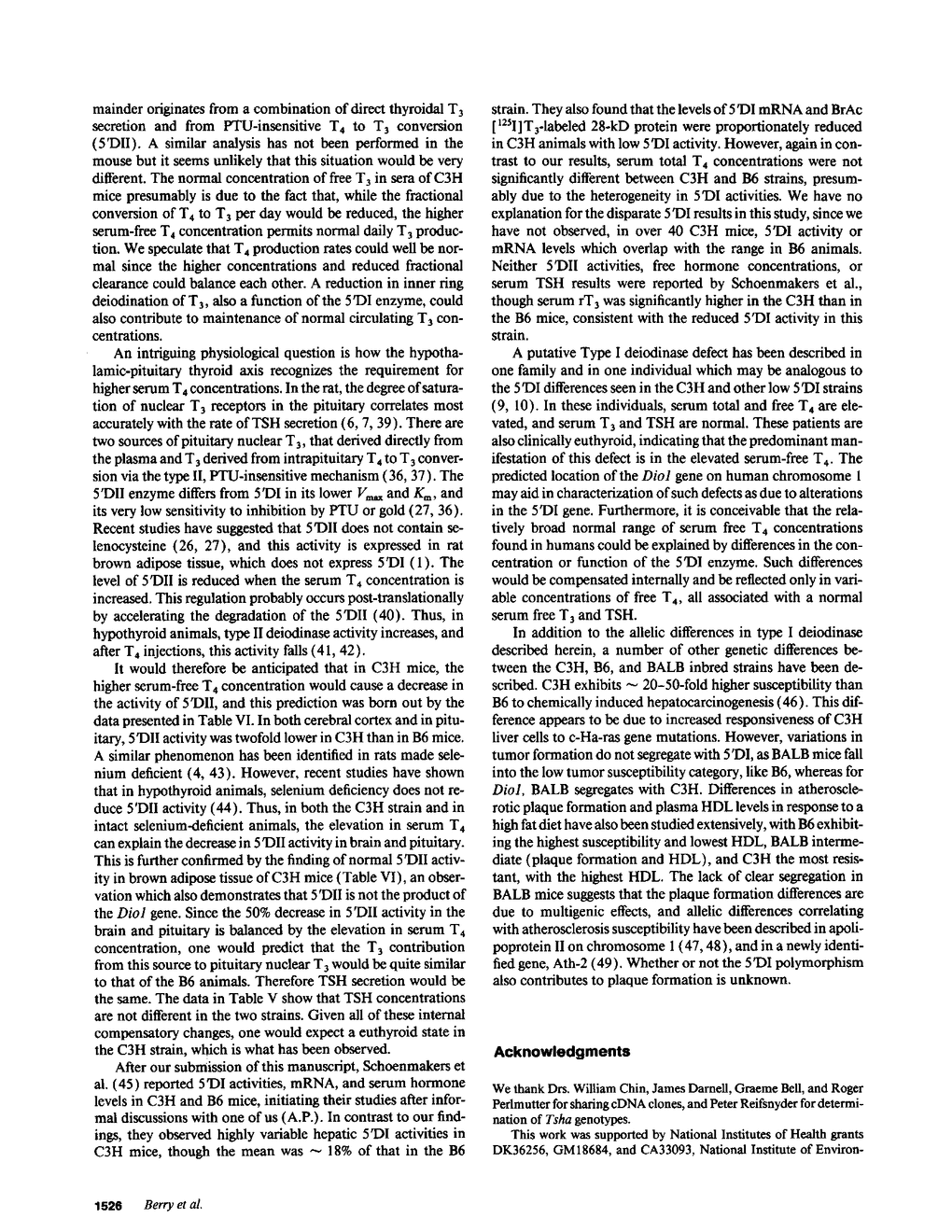 Inbred mouse strains differ in their capacity to deiodinate iododioxin and iodothyronines, with strains segregating into high or low activity groups. Metabolism of iododioxin occurs via the type I iodothyronine 5'deiodinase (5'DI), one of two enzymes that metabolize thyroxine (T4) to 3,5,3'-triiodothyronine (T3). Recombinant inbred strains derived from crosses between high and low activity strains exhibit segregation characteristic of a single allele difference. Hepatic and renal 5'DI mRNA in a high (C57BL/6J) and low (C3H/HeJ) strain paralleled enzyme activity and concentration, in agreement with a recent report. 5'DI-deficient mice had twofold higher serum free T4 but normal free T3 and thyrotropin. Brown adipose tissue 5'DII was invariant between the two strains. Southern analyses using a 5'DI probe identified a restriction fragment length variant that segregated with 5'DI activity in 33 of 35 recombinant inbred strains derived from four different pairs of high and low activity parental strains. Recombination frequencies using previously mapped loci allowed assignment of the 5'DI gene to mouse chromosome 4 and identified its approximate chromosomal position. We propose the symbol Dio1 to denote the mouse 5'DI gene. Conserved linkage between this segment of mouse chromosome 4 and human HSA1p predicts this location for human Dio1.