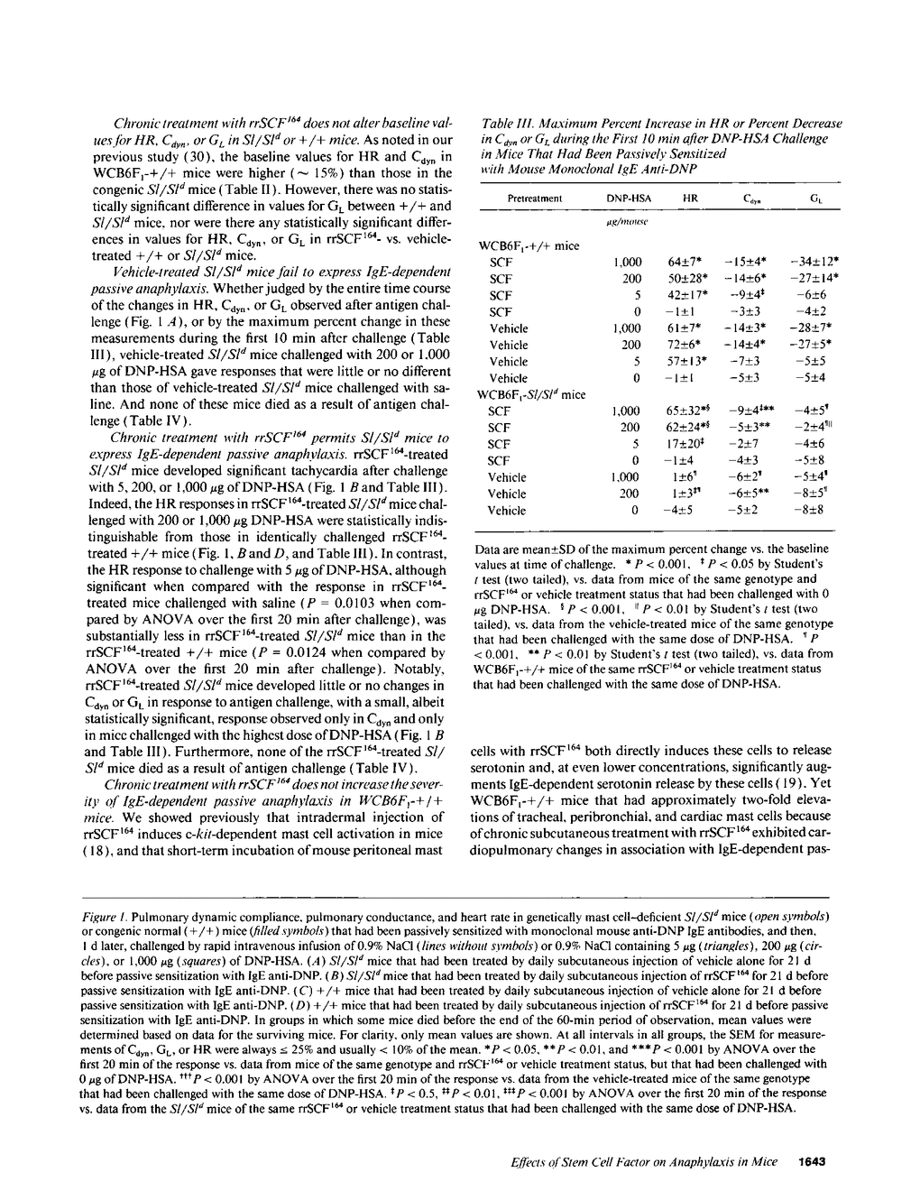 We treated genetically mast cell-deficient WCB6F1-Sl/Sld mice and the congenic normal (WCB6F1(-)+/+) mice with the c-kit ligand recombinant rat stem cell factor164 (rrSCF164; 100 micrograms/kg per d, subcutaneously) or with vehicle for 21 d, then passively sensitized the mice with anti-dinitrophenol30-40 immunoglobulin E (IgE) antibodies, and 1 d later measured the changes in heart rate, pulmonary dynamic compliance, and pulmonary conductance, and assessed the death rates associated with intravenous challenge of these animals with specific antigen. rrSCF164 treatment induced the development of mast cells in Sl/Sld mice, and these mice exhibited tachycardia, but not death, after challenge with IgE and antigen. rrSCF164 treatment induced mast cell hyperplasia in +/+ mice, but the cardiopulmonary changes associated with passive anaphylaxis in these mice were virtually indistinguishable from those observed in control +/+ mice treated with vehicle instead of rrSCF164. Moreover, the highest dose of antigen challenge produced significantly fewer fatalities in rrSCF164-treated than in vehicle-treated +/+ mice (1/11 vs. 8/11, respectively, P < 0.01). Thus, in normal mice, chronic treatment with rrSCF164 induces mast cell hyperplasia but does not increase, and in certain respects diminishes, the severity of IgE-dependent anaphylactic reactions.