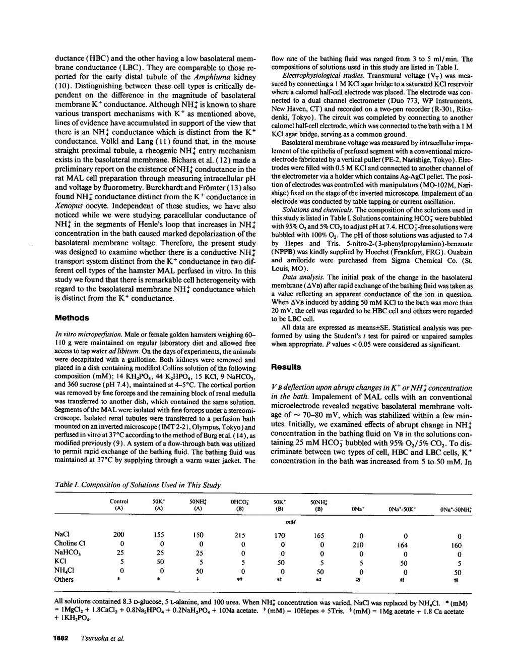 The epithelia of the medullary thick ascending limb (MAL) consists of two cell types, high (HBC) and low basolateral conductance (LBC) cell, depending on the K+ conductance of the basolateral membrane. The NH4+ conductance distinct from the K+ conductance has been suggested to exist in the proximal tubule, MAL cell, and Xenopus oocyte. The present study was designed to examine whether there is a conductive NH4+ transport system distinct from K+ conductance in two different cell types of the hamster MAL perfused in vitro. The basolateral membrane voltage (VB) was measured by impaling cells with conventional microelectrodes. Addition of NH4+ to the bath depolarized VB in a dose-dependent manner in both cell types. The response was maintained in the absence of HCO3-. When the VB deflection elicited upon 50 mM KCl or NH4Cl in the bath (delta VBK+ or delta VBNH4+) were compared, delta VBNH4+ was almost the same as delta VBK+ in the HBC cell, whereas the former was greater than the latter in the LBC. In the HBC cell, 10 mM Ba2+ in the bath equally suppressed both delta VBK+ and delta VBNH4+, whereas in the LBC cell it suppressed delta VBK+ with a small effect on delta VBNH4+, indicating that NH4+ is transported via a pathway distinct from Ba(2+)-sensitive K+ conductance. The VB deflection by NH4+ was unaffected by addition of 0.1 mM ouabain or 10 microM 5-nitro-2-(3-phenylpropylamino)-benzoate (a Cl- channel blocker) to the bath, excluding the contribution of the Na+, K+ pump or Cl- channel. An abrupt reduction of Na+ in the bath from 200 to 20 mM did not cause any changes in VB, suggesting that a nonselective cation channel may not account for the NH4+ transport. Amiloride at 10 microM inhibited delta VBNH4+ with a higher efficacy in the LBC cell. We conclude that a rheogenic NH4+ transport system independent from the K+ conductance exists in the basolateral membrane of the LBC cell of the hamster MAL, and may play some roles in the regulation of NH4+ transport.