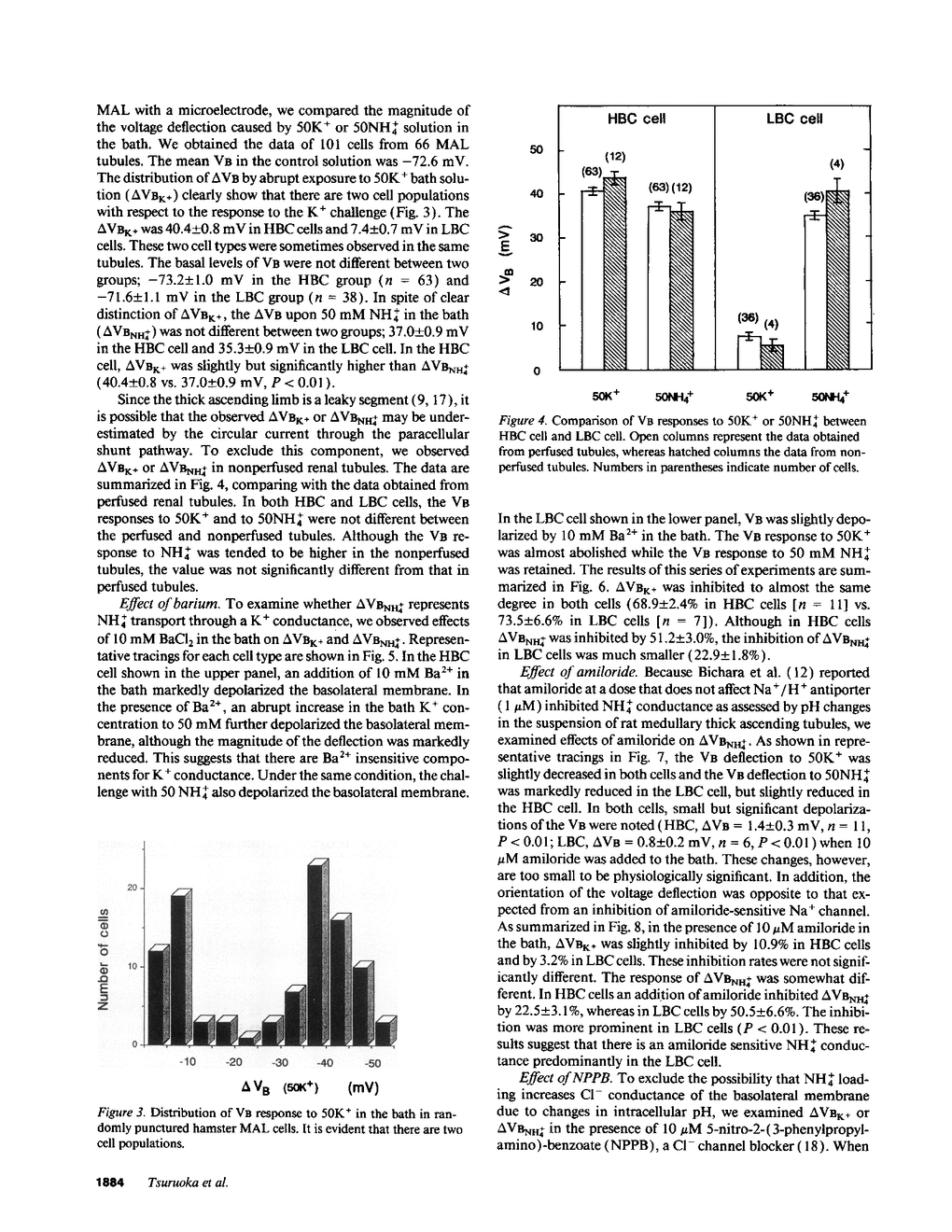 The epithelia of the medullary thick ascending limb (MAL) consists of two cell types, high (HBC) and low basolateral conductance (LBC) cell, depending on the K+ conductance of the basolateral membrane. The NH4+ conductance distinct from the K+ conductance has been suggested to exist in the proximal tubule, MAL cell, and Xenopus oocyte. The present study was designed to examine whether there is a conductive NH4+ transport system distinct from K+ conductance in two different cell types of the hamster MAL perfused in vitro. The basolateral membrane voltage (VB) was measured by impaling cells with conventional microelectrodes. Addition of NH4+ to the bath depolarized VB in a dose-dependent manner in both cell types. The response was maintained in the absence of HCO3-. When the VB deflection elicited upon 50 mM KCl or NH4Cl in the bath (delta VBK+ or delta VBNH4+) were compared, delta VBNH4+ was almost the same as delta VBK+ in the HBC cell, whereas the former was greater than the latter in the LBC. In the HBC cell, 10 mM Ba2+ in the bath equally suppressed both delta VBK+ and delta VBNH4+, whereas in the LBC cell it suppressed delta VBK+ with a small effect on delta VBNH4+, indicating that NH4+ is transported via a pathway distinct from Ba(2+)-sensitive K+ conductance. The VB deflection by NH4+ was unaffected by addition of 0.1 mM ouabain or 10 microM 5-nitro-2-(3-phenylpropylamino)-benzoate (a Cl- channel blocker) to the bath, excluding the contribution of the Na+, K+ pump or Cl- channel. An abrupt reduction of Na+ in the bath from 200 to 20 mM did not cause any changes in VB, suggesting that a nonselective cation channel may not account for the NH4+ transport. Amiloride at 10 microM inhibited delta VBNH4+ with a higher efficacy in the LBC cell. We conclude that a rheogenic NH4+ transport system independent from the K+ conductance exists in the basolateral membrane of the LBC cell of the hamster MAL, and may play some roles in the regulation of NH4+ transport.