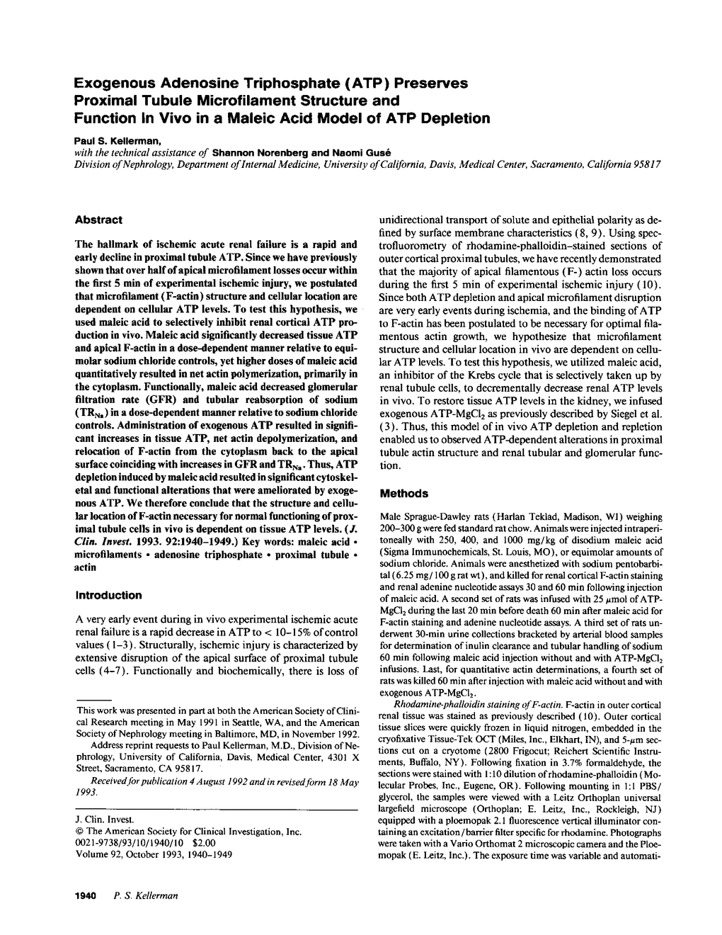 The hallmark of ischemic acute renal failure is a rapid and early decline in proximal tubule ATP. Since we have previously shown that over half of apical microfilament losses occur within the first 5 min of experimental ischemic injury, we postulated that microfilament (F-actin) structure and cellular location are dependent on cellular ATP levels. To test this hypothesis, we used maleic acid to selectively inhibit renal cortical ATP production in vivo. Maleic acid significantly decreased tissue ATP and apical F-actin in a dose-dependent manner relative to equimolar sodium chloride controls, yet higher doses of maleic acid quantitatively resulted in net actin polymerization, primarily in the cytoplasm. Functionally, maleic acid decreased glomerular filtration rate (GFR) and tubular reabsorption of sodium (TRNa) in a dose-dependent manner relative to sodium chloride controls. Administration of exogenous ATP resulted in significant increases in tissue ATP, net actin depolymerization, and relocation of F-actin from the cytoplasm back to the apical surface coinciding with increases in GFR and TRNa. Thus, ATP depletion induced by maleic acid resulted in significant cytoskeletal and functional alterations that were ameliorated by exogenous ATP. We therefore conclude that the structure and cellular location of F-actin necessary for normal functioning of proximal tubule cells in vivo is dependent on tissue ATP levels.