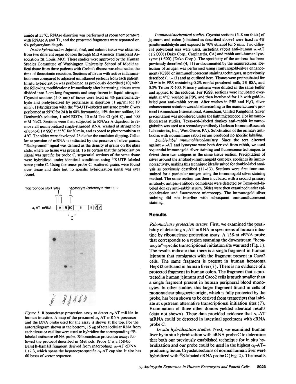 alpha 1-Antitrypsin (alpha 1-AT) is an acute phase plasma protein predominantly derived from the liver which inhibits neutrophil elastase. Previous studies have suggested that alpha 1-AT is also expressed in human enterocytes because alpha 1-AT mRNA could be detected in human jejunum by RNA blot analysis, and alpha 1-AT synthesis could be detected in a human intestinal adenocarcinoma cell line Caco2, which spontaneously differentiates into villous-like enterocytes in tissue culture. To definitively determine that the alpha 1-AT gene is expressed in human enterocytes in vivo, we examined tissue slices of human jejunum and ileum by in situ hybridization. The results demonstrate specific hybridization to enterocytes from the bases to the tips of the villi. Although there was no hybridization to enterocytes in most of the crypt epithelium, there was intense specific hybridization in one region of the crypt. Double-label immunohistochemical studies showed that alpha 1-AT and lysozyme co-localized to this region, indicating that it represented Paneth cells. Finally, there was a marked increase in hybridization to alpha 1-AT mRNA in villous enterocytes and Paneth cells in Crohn's disease. The results of this study provide definitive evidence that alpha 1-AT is expressed in human jejunal and ileal enterocytes in vivo, and show that alpha 1-AT is also a product of Paneth cells. Together with the results of other studies, these data raise the possibility that alpha 1-AT detected in fecal alpha 1-AT clearance assays for diagnosing protein-losing enteropathies is predominantly derived from sloughed enterocytes.