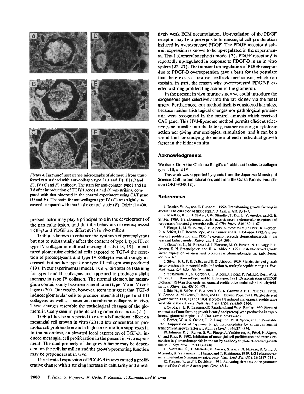 Glomerulosclerosis, a final common lesion of various glomerular diseases, is characterized by mesangial cell proliferation and extracellular matrix (ECM) expansion. TGF-beta and PDGF are known to play a critical role in the regulation of ECM metabolism and mesenchymal cell proliferation, respectively. However, there is little evidence to demonstrate the direct role of each of these growth factors in the pathogenesis of glomerulosclerosis. Using an in vivo transfection technique, we could realize the selective overexpression of single growth factor in the kidney. The introduction of either TGF-beta or PDGF-B gene alone into the kidney induced glomerulosclerosis, although the patterns of action of these growth factors were different; TGF-beta affected ECM accumulation rather than cell proliferation and PDGF affected the latter rather than the former.