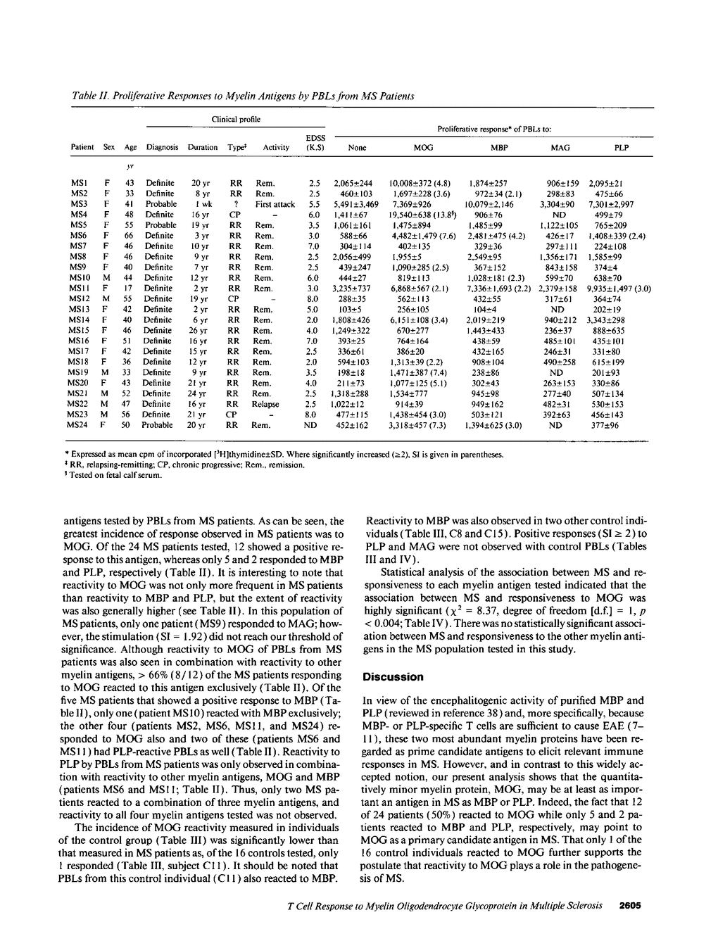 Although T cell responses to the quantitatively major myelin proteins, myelin basic protein (MBP) and proteolipid protein (PLP), are likely to be of importance in the course of multiple sclerosis (MS), cell-mediated autoimmune responses to other myelin antigens, in particular quantitatively minor myelin antigens, such as myelin-associated glycoprotein (MAG) and the central nervous system-specific myelin oligodendrocyte glycoprotein (MOG), could also play a prevalent role in disease initiation or progression. Highly purified myelin antigens were used in this study to assess cell-mediated immune response to MOG in MS patients, in the context of the reactivity to other myelin antigens, MBP, PLP, and MAG. The greatest incidence of proliferative response by MS peripheral blood lymphocytes was to MOG, as 12 of 24 patients tested reacted and, of these, 8 reacted to MOG exclusively. In contrast, only 1 control individual of 16 tested reacted positively to MOG. The incidence of responses to MBP, PLP, and MAG did not differ greatly between MS patients and control individuals. A predominant T cell reactivity to MOG in MS suggests an important role for cell-mediated immune response to this antigen in the pathogenesis of MS.