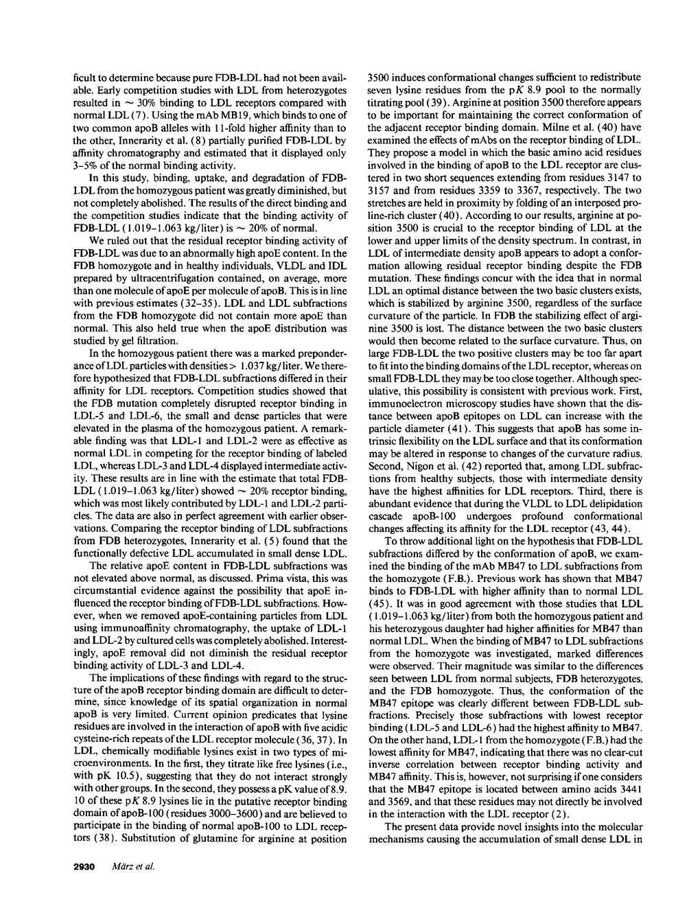 The interaction of LDL and LDL subfractions from a patient homozygous for familial defective apoB-100 (FDB) has been studied. His LDL cholesterol ranged from 2.65 to 3.34 g/liter. In cultured fibroblasts, binding, internalization, and degradation of the patient's LDL was diminished, but not completely abolished. The patient's apolipoprotein E concentration was low, and the amount of apolipoprotein E associated with LDL was not elevated over normal. LDL were separated into six subfractions: LDL-1 (1.019-1.031 kg/liter), LDL-2 (1.031-1.034 kg/liter), LDL-3 (1.034-1.037 kg/liter), LDL-4 (1.037-1.040 kg/liter), LDL-5 (1.040-1.044 kg/liter), and LDL-6 (> 1.044 kg/liter). LDL-5 and LDL-6 selectively accumulated in the patient's plasma. Concentrations of LDL-1 to 3 were normal. The LDL receptor-mediated uptake of LDL-1 and LDL-2 could not be distinguished from normal LDL. LDL-3 and LDL-4 displayed reduced uptake; LDL-5 and LDL-6 were completely defective in binding. When apolipoprotein E-containing particles were removed by immunoabsorption before preparing subfractions, LDL-3 and LDL-4, but not LDL-1 and LDL-2, retained some receptor binding activity. We conclude that in FDB, LDL-1 and LDL-2 contain sufficient apolipoprotein E to warrant normal cellular uptake. In LDL-3 and LDL-4, the defective apoB-100 itself displays some receptor binding; LDL-5 and LDL-6 are inable to interact with LDL receptors and accumulate in plasma.