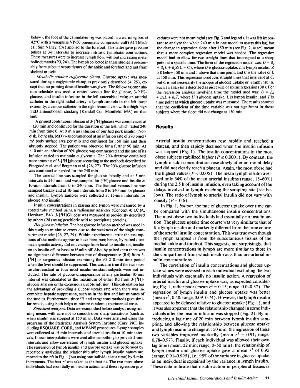 Insulin action and obesity are both correlated with the density of muscle capillary supply in humans. Since the altered muscle anatomy in the obese might affect interstitial insulin concentrations and reduce insulin action, we have cannulated peripheral lymphatic vessels in lean and obese males, and compared peripheral lymph insulin concentrations with whole body glucose uptake during a euglycemic, hyperinsulinemic clamp. Lymph insulin concentrations in the lower limb averaged only 34% of arterial insulin concentrations during 150 min of insulin infusion. Obese subjects had the highest arterial (P < or = 0.0001) and lymph insulin (P < 0.005) concentrations, but the lowest glucose uptake rates (P < 0.002). In contrast to the initial steep rise then plateau of arterial insulins, both lymph insulin and whole body glucose uptake rates rose slowly and did not consistently reach a plateau. In each individual, the glucose uptake closely correlated with peripheral lymphatic insulin concentrations (mean r2 = 0.95). The coupling between glucose uptake and lymph insulin (glucose uptake/pmol insulin) was much steeper in lean subjects than in the obese (P < or = 0.0001). These results indicate that even if insulin diffusion into tissues is rate limiting for insulin action, a tissue defect rather than an insulin diffusion defect causes insulin resistance in obese subjects.