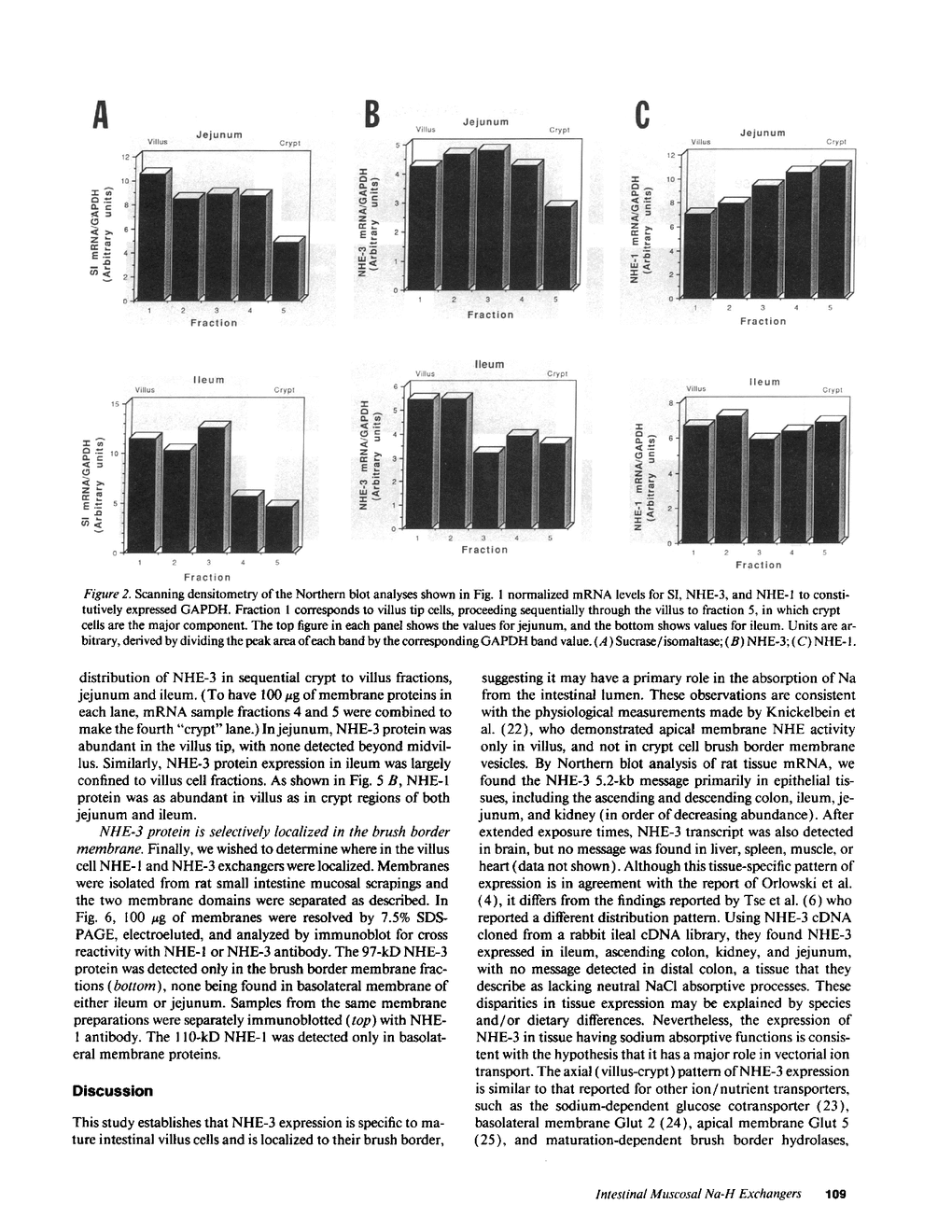 Na-H exchange (NHE) is one of the major non-nutritive Na absorptive pathways of the intestine and kidney. Of the four NHE isoforms that have been cloned, only one, NHE-3, appears to be epithelial specific. We have examined the regional and cellular expression of NHE-3 in the rat intestine. NHE-3 message in the small intestine was more abundant in the villus fractions of the small intestine than in the crypts. Analysis of NHE-3 mRNA distribution in the gut by in situ hybridization demonstrated epithelial cell specificity, as well as expression preferential to villus cells. NHE-1 message, in contrast, was ubiquitous, with slightly greater expression exhibited in the differentiating crypt and lower villus cells of the small intestine. Isoform-specific NHE-3 fusion protein antibody identified a 97-kD membrane protein in the upper villus cells of the small intestine, which was exclusively localized in the apical membrane. In contrast, antibody previously developed against the COOH-terminal region of human NHE-1 (McSwine, R. L., G. Babnigg, M. W. Musch, E. B. Chang, and M. L. Villereal, manuscript submitted for publication) identified a 110-kD basolateral membrane protein. These data suggest that unlike NHE-1, which probably serves a "housekeeping" function, NHE-3 may be involved in vectorial Na transport by the intestine.