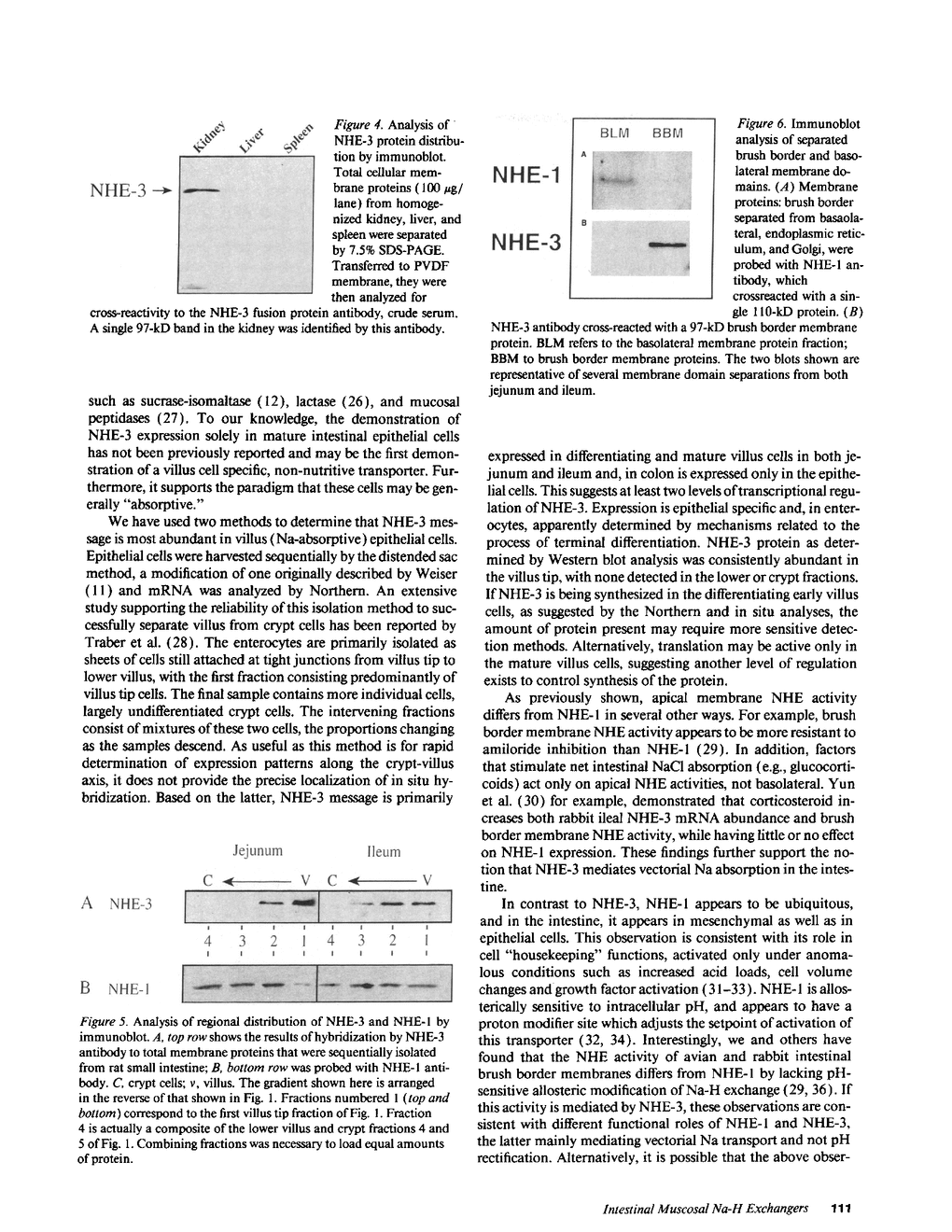 Na-H exchange (NHE) is one of the major non-nutritive Na absorptive pathways of the intestine and kidney. Of the four NHE isoforms that have been cloned, only one, NHE-3, appears to be epithelial specific. We have examined the regional and cellular expression of NHE-3 in the rat intestine. NHE-3 message in the small intestine was more abundant in the villus fractions of the small intestine than in the crypts. Analysis of NHE-3 mRNA distribution in the gut by in situ hybridization demonstrated epithelial cell specificity, as well as expression preferential to villus cells. NHE-1 message, in contrast, was ubiquitous, with slightly greater expression exhibited in the differentiating crypt and lower villus cells of the small intestine. Isoform-specific NHE-3 fusion protein antibody identified a 97-kD membrane protein in the upper villus cells of the small intestine, which was exclusively localized in the apical membrane. In contrast, antibody previously developed against the COOH-terminal region of human NHE-1 (McSwine, R. L., G. Babnigg, M. W. Musch, E. B. Chang, and M. L. Villereal, manuscript submitted for publication) identified a 110-kD basolateral membrane protein. These data suggest that unlike NHE-1, which probably serves a "housekeeping" function, NHE-3 may be involved in vectorial Na transport by the intestine.