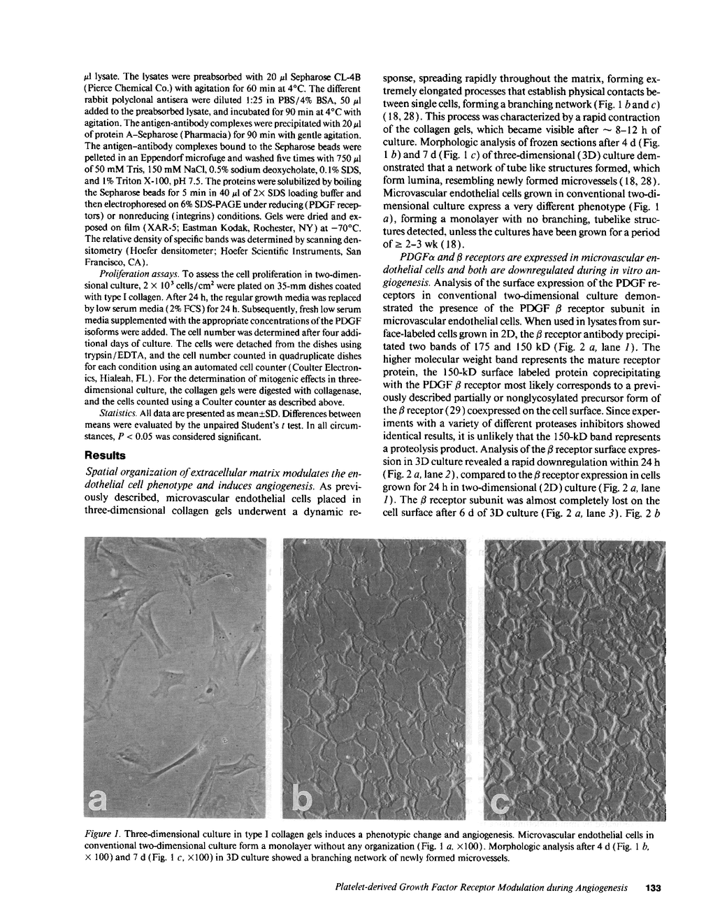 Microvascular endothelial cells in vivo exhibit a plastic phenotype, forming a nonproliferative, differentiated capillary network, while retaining their ability to respond to injury by proliferation, migration and neovascularization. The presence of PDGF receptors and PDGF responsiveness in microvascular endothelial cells and the significance of PDGF isoforms in the control of endothelial cell growth and differentiation remain controversial. Since culture of microvascular endothelial cells in a three-dimensional (3D) system induced cell differentiation and angiogenesis and inhibited proliferation, the present study investigates the role of different extracellular matrix environments in inducing different microvascular endothelial cell phenotypes on microvascular endothelial cell PDGF receptor expression and PDGF responsiveness. In conventional two-dimensional (2D) culture, microvascular endothelial cells expressed both PDGF receptor alpha and beta chains. Suramin treatment demonstrated continuous downregulation of the alpha receptor surface expression. PDGF BB and, to a lesser extent, PDGF AB were mitogenic in 2D-culture, PDGF AA failed to induce any proliferative response despite inducing receptor autophosphorylation. During in vitro angiogenesis induced by 3D-culture, both PDGF receptors were rapidly downregulated. Assessment of cell proliferation showed quiescent cells and PDGF unresponsiveness. We conclude that the induction of a differentiated phenotype during in vitro angiogenesis (tube formation) driven in part by the spatial organization of the surrounding matrix is associated with a downregulation of PDGF receptors. Identification of the molecular cell-matrix interactions involved in this receptor regulation may allow for targeted manipulation of cell growth in vivo and lead to novel therapeutic applications for PDGF.