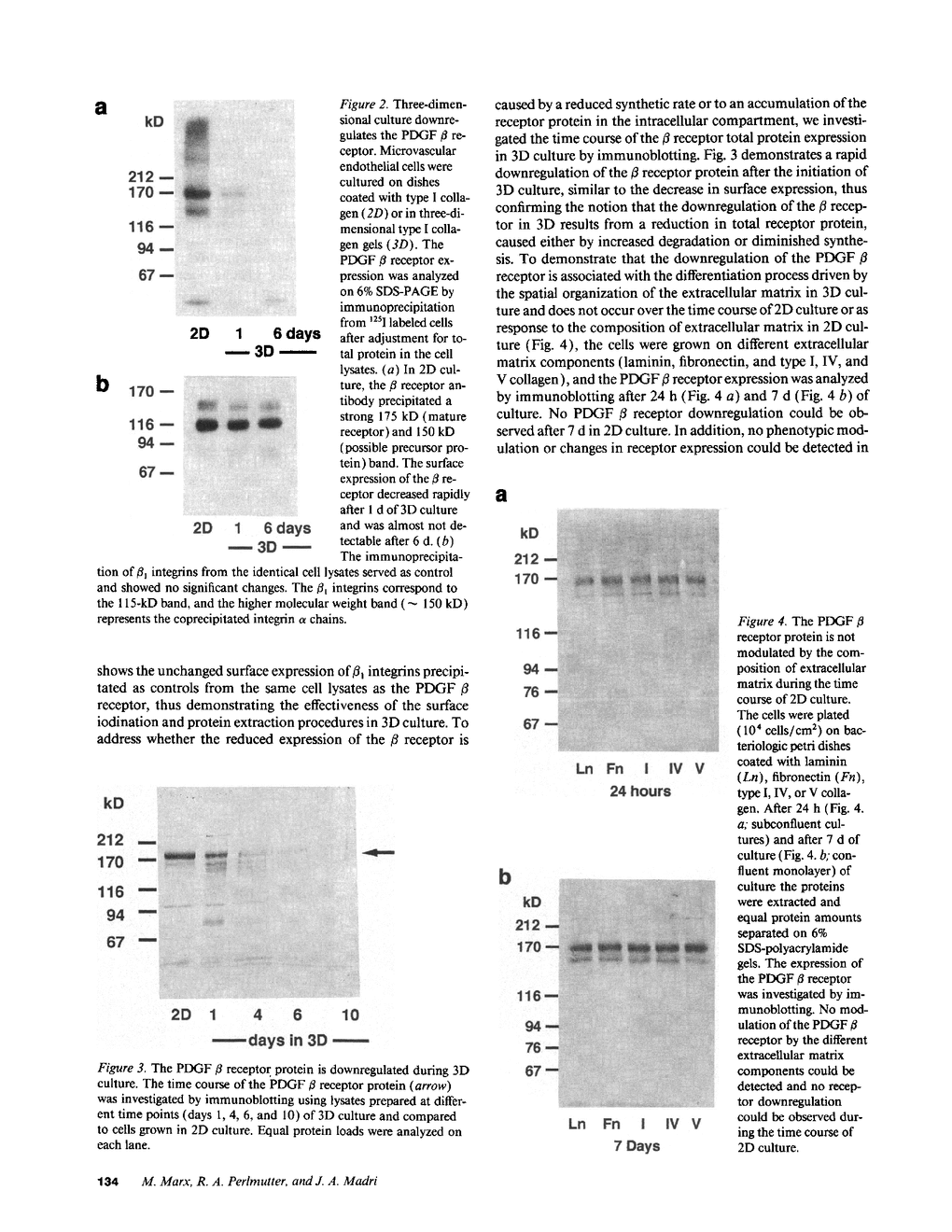 Microvascular endothelial cells in vivo exhibit a plastic phenotype, forming a nonproliferative, differentiated capillary network, while retaining their ability to respond to injury by proliferation, migration and neovascularization. The presence of PDGF receptors and PDGF responsiveness in microvascular endothelial cells and the significance of PDGF isoforms in the control of endothelial cell growth and differentiation remain controversial. Since culture of microvascular endothelial cells in a three-dimensional (3D) system induced cell differentiation and angiogenesis and inhibited proliferation, the present study investigates the role of different extracellular matrix environments in inducing different microvascular endothelial cell phenotypes on microvascular endothelial cell PDGF receptor expression and PDGF responsiveness. In conventional two-dimensional (2D) culture, microvascular endothelial cells expressed both PDGF receptor alpha and beta chains. Suramin treatment demonstrated continuous downregulation of the alpha receptor surface expression. PDGF BB and, to a lesser extent, PDGF AB were mitogenic in 2D-culture, PDGF AA failed to induce any proliferative response despite inducing receptor autophosphorylation. During in vitro angiogenesis induced by 3D-culture, both PDGF receptors were rapidly downregulated. Assessment of cell proliferation showed quiescent cells and PDGF unresponsiveness. We conclude that the induction of a differentiated phenotype during in vitro angiogenesis (tube formation) driven in part by the spatial organization of the surrounding matrix is associated with a downregulation of PDGF receptors. Identification of the molecular cell-matrix interactions involved in this receptor regulation may allow for targeted manipulation of cell growth in vivo and lead to novel therapeutic applications for PDGF.