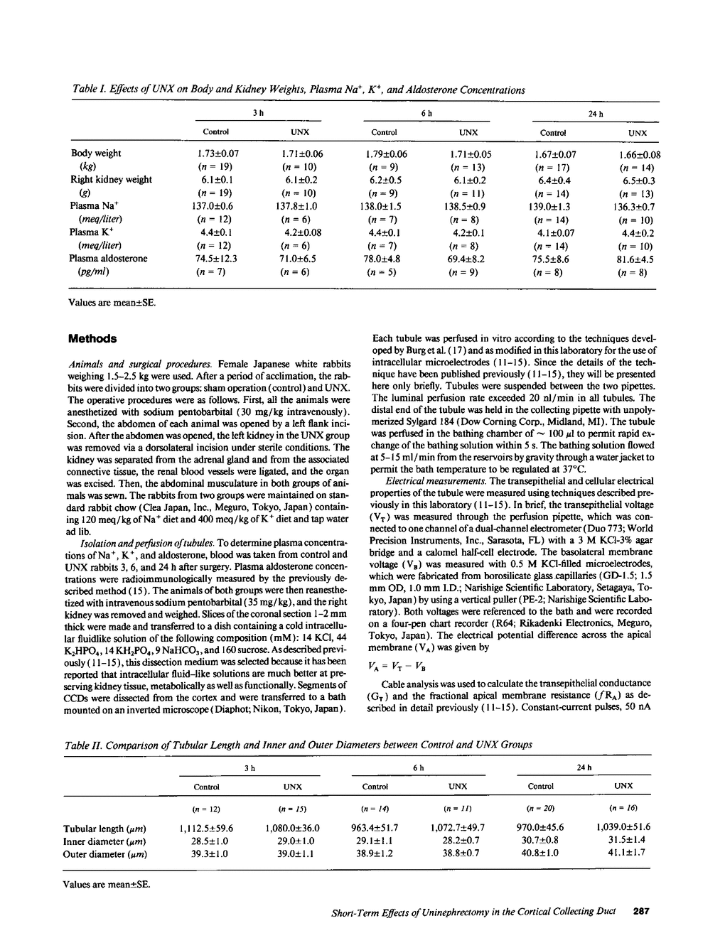 Microelectrode techniques were used to assess the electrical properties of the collecting duct cell in the isolated perfused cortical collecting duct from remnant kidneys 3, 6, and 24 h after uninephrectomy (UNX); results were compared with those from sham-operated kidneys. Plasma aldosterone levels did not change during the time course after UNX. The lumen-negative transepithelial voltage was elevated significantly 3 h after UNX, and was increased further 24 h after UNX. The basolateral membrane voltage (VB) was elevated 6 h after UNX, and then was increased further at 24 h. Although the tight junction conductance and the fractional apical membrane resistance (fRA) were not altered at any time points after UNX, the apical membrane conductance as well as the transepithelial (GT) and basolateral membrane conductances increased 6 and 24 h after UNX. The changes in apical membrane voltage, GT, and fRA upon addition of luminal amiloride increased just 3 h after UNX, and then remained elevated at 6 and 24 h. The changes in apical membrane voltage and GT upon addition of luminal Ba2+, the changes in VB upon addition of bath ouabain, and the changes in VB, GT, and fRA upon raising bath K+ were not influenced 3 h after UNX, but increased at 6 and 24 h. At these latter periods after UNX, the transference number of Cl- of the basolateral membrane decreased significantly, whereas the transference number of K+ of the basolateral membrane increased significantly. Simultaneously, addition of Ba2+ to the bath caused the VB to hyperpolarize in parallel with decreases in GT and fRA. We conclude: (a) the initial effect of UNX (3 h) in the collecting duct cell is an increase in apical membrane Na+ conductance; (b) the delayed effects of UNX (6 and 24 h) are increases in apical membrane K+ conductance as well as basolateral membrane Na(+)-K+ pump activity and K+ conductance; (c) the hyperpolarization of VB at 6 and 24 h after UNX may result in the decrease of the ratio of the relative Cl- conductance to the relative K+ conductance of the basolateral membrane and also may increase passive K+ entry into the cell across the basolateral membrane; (d) these time-dependent electrical changes occur independently of plasma aldosterone levels.