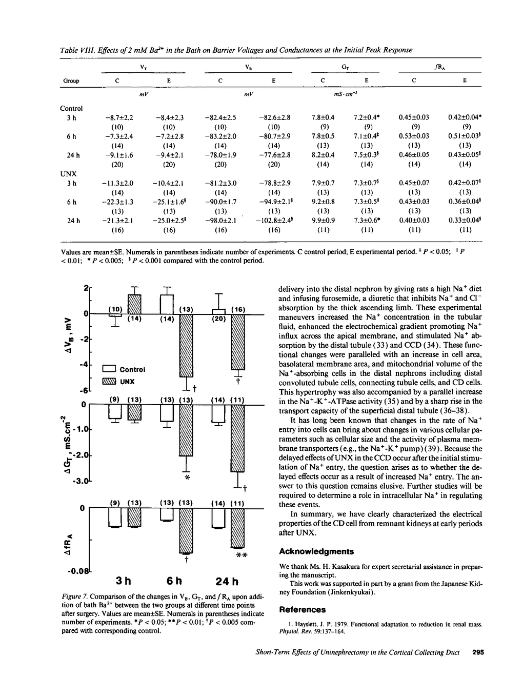 Microelectrode techniques were used to assess the electrical properties of the collecting duct cell in the isolated perfused cortical collecting duct from remnant kidneys 3, 6, and 24 h after uninephrectomy (UNX); results were compared with those from sham-operated kidneys. Plasma aldosterone levels did not change during the time course after UNX. The lumen-negative transepithelial voltage was elevated significantly 3 h after UNX, and was increased further 24 h after UNX. The basolateral membrane voltage (VB) was elevated 6 h after UNX, and then was increased further at 24 h. Although the tight junction conductance and the fractional apical membrane resistance (fRA) were not altered at any time points after UNX, the apical membrane conductance as well as the transepithelial (GT) and basolateral membrane conductances increased 6 and 24 h after UNX. The changes in apical membrane voltage, GT, and fRA upon addition of luminal amiloride increased just 3 h after UNX, and then remained elevated at 6 and 24 h. The changes in apical membrane voltage and GT upon addition of luminal Ba2+, the changes in VB upon addition of bath ouabain, and the changes in VB, GT, and fRA upon raising bath K+ were not influenced 3 h after UNX, but increased at 6 and 24 h. At these latter periods after UNX, the transference number of Cl- of the basolateral membrane decreased significantly, whereas the transference number of K+ of the basolateral membrane increased significantly. Simultaneously, addition of Ba2+ to the bath caused the VB to hyperpolarize in parallel with decreases in GT and fRA. We conclude: (a) the initial effect of UNX (3 h) in the collecting duct cell is an increase in apical membrane Na+ conductance; (b) the delayed effects of UNX (6 and 24 h) are increases in apical membrane K+ conductance as well as basolateral membrane Na(+)-K+ pump activity and K+ conductance; (c) the hyperpolarization of VB at 6 and 24 h after UNX may result in the decrease of the ratio of the relative Cl- conductance to the relative K+ conductance of the basolateral membrane and also may increase passive K+ entry into the cell across the basolateral membrane; (d) these time-dependent electrical changes occur independently of plasma aldosterone levels.