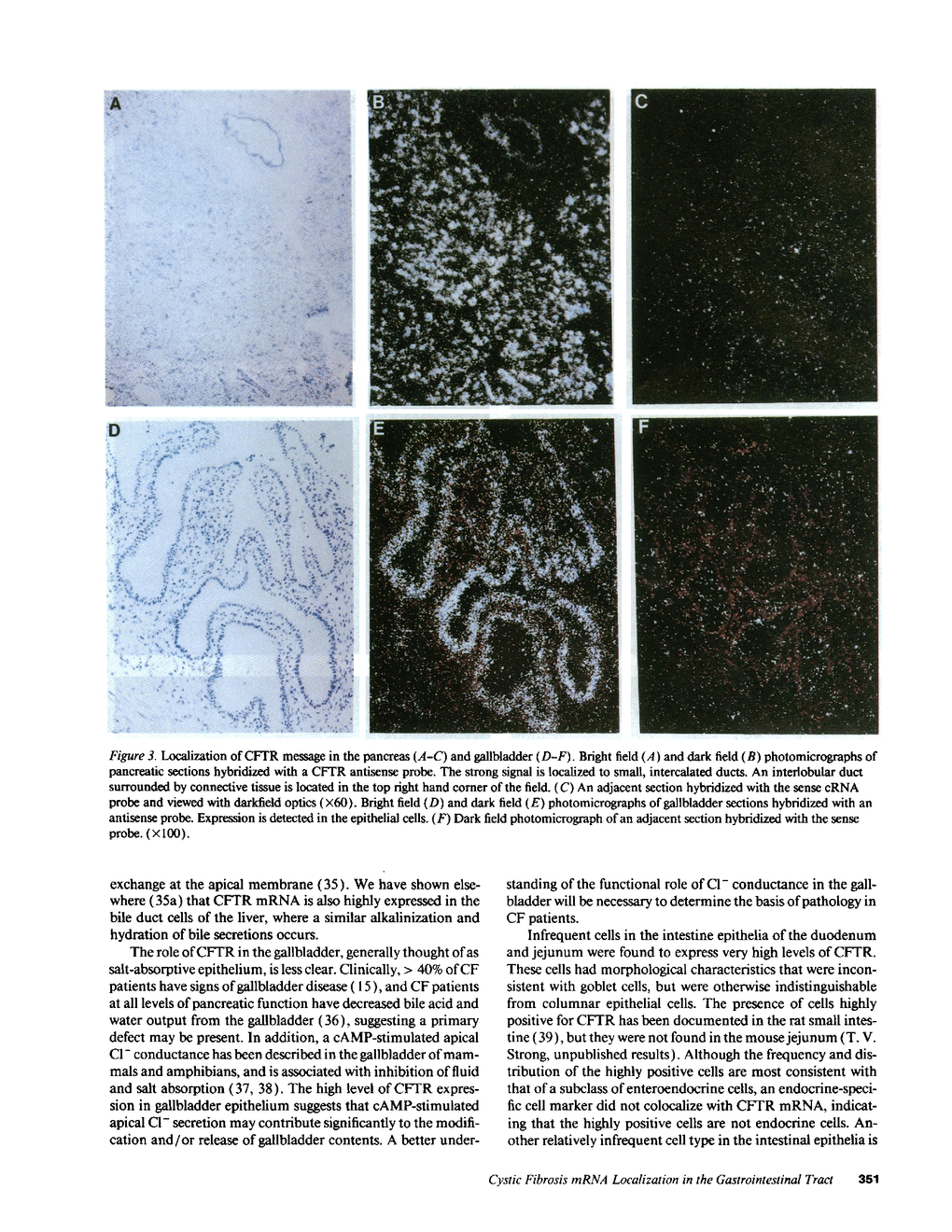 We have used in situ hybridization to localize expression of the cystic fibrosis transmembrane conductance regulator (CFTR) gene in the human gastrointestinal tract and associated organs. The stomach exhibits a low level of CFTR expression throughout gastric mucosa. In the small intestine, expression is relatively high in the mucosal epithelium, with a decreasing gradient of expression along the crypt to tip axis. The cells of the Brunner's glands express high levels of CFTR mRNA. In addition, there is a small subpopulation of highly positive cells scattered along the epithelium in the duodenum and jejunum, but not in the ileum. These cells do not represent endocrine cells, as determined by lack of colocalization with an endocrine-specific marker. The distribution of CFTR mRNA in the colon is similar to the small intestine, with highest level of expression in the epithelial cells at the base of the crypts. In the pancreas, CFTR is expressed at high levels in the small, intercalated ducts and at lower levels in the interlobular ducts. CFTR transcripts are expressed at uniformly high levels in the epithelium of the gallbladder. Throughout the gastrointestinal tract, CFTR expression is increased in mucosal epithelial cells that are near lymph nodules.