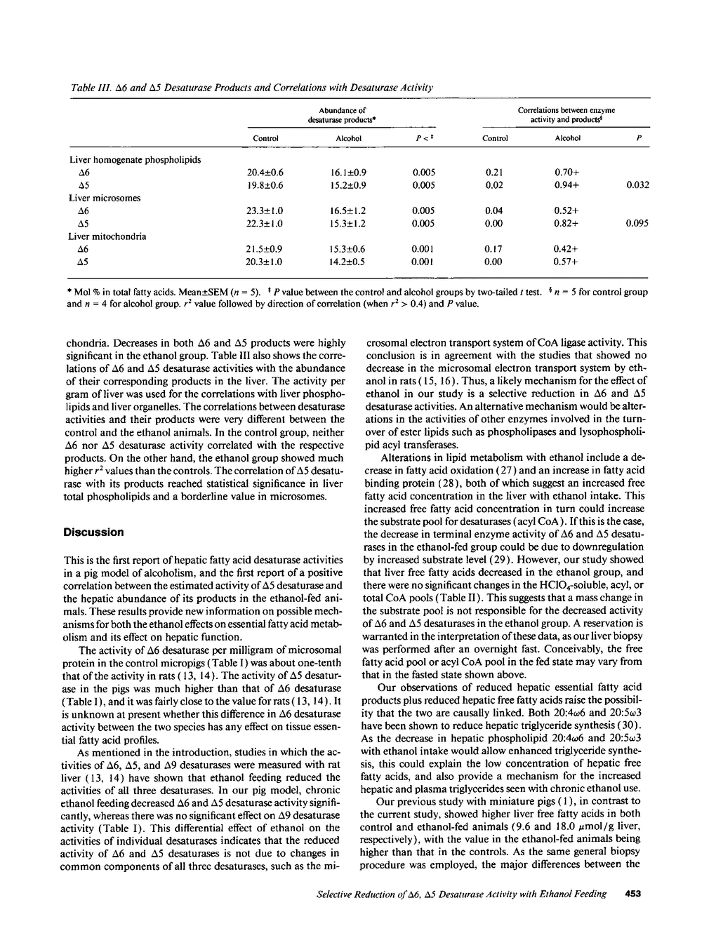 This study investigated the mechanism by which chronic ethanol feeding reduces arachidonate and other highly unsaturated fatty acids in pig liver phospholipids. Five micropigs were fed a diet providing 89 kcal/kg body wt for 12 mo, with ethanol and fat as 40 and 34% of energy, respectively. Five control pigs were pairfed corn starch instead of ethanol. The activities of delta 6 and delta 5 desaturases (expressed as microsomal conversion of precursor to product) in liver from ethanol-fed pigs were reduced to less than half that of controls, whereas the activity of delta 9 desaturase was unaffected in the ethanol group. delta 5 Desaturase activity showed positive correlation with the abundance of its products in liver total phospholipids and microsomes in the ethanol group, but not in the controls. Correlation between delta 6 desaturase activity and its products showed similar pattern to that of delta 5 desaturase, but did not reach statistical significance. No difference was observed between the two groups in coenzyme A concentration in the liver. These results suggest that the selective reduction of delta 6 and delta 5 desaturase activities, not the microsomal electron transport system, are directly responsible for the altered profile of liver phospholipids.