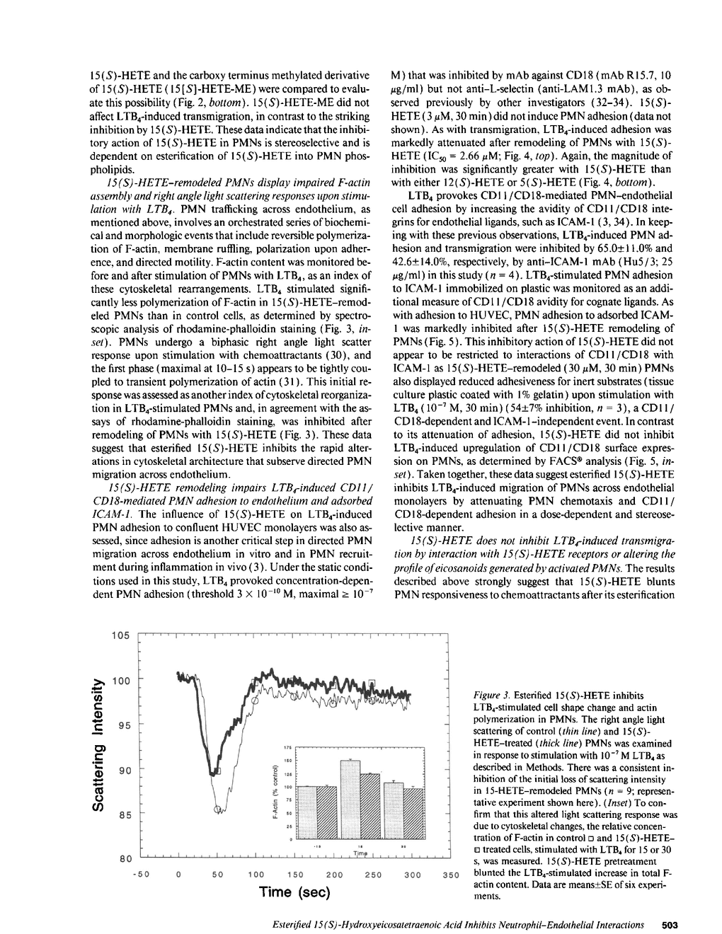 5-Lipoxygenase products, such as leukotrienes, are important stimuli for leukocyte-mediated tissue injury in acute inflammation. 15-Hydroxyeicosatetraenoic acid (15-HETE) is an eicosanoid generated by a variety of cell types via the actions of 15-lipoxygenases and, in addition, cyclooxygenases and epoxygenases. 15-HETE levels are frequently elevated at sites of inflammation, and extracellular 15(S)-HETE is esterified rapidly into neutrophil (PMN) phospholipids in vitro to levels that are comparable with arachidonic acid. We present evidence that remodeling of PMN phospholipids with 15(S)-HETE stereoselectively inhibits PMN migration across endothelium in response to leukotriene B4 (LTB4) and other chemoattractants. Esterified 15(S)-HETE causes a striking reduction in the affinity of LTB4 cell-surface receptors for their ligand and inhibition of LTB4-triggered stimulus-response coupling. As a result of these actions, esterified 15(S)-HETE attenuates the cytoskeletal rearrangements and CD11/CD18-mediated adhesive events that subserve directed locomotion of PMN across endothelium. These observations indicate that products of the 5-lipoxygenase and 15-lipoxygenase pathways can exert counterbalancing influences on PMN trafficking across endothelium. They suggest that 15(S)-HETE may be a potent endogenous inhibitor of PMN-endothelial interactions in vivo and serve to limit or reverse acute inflammation.
