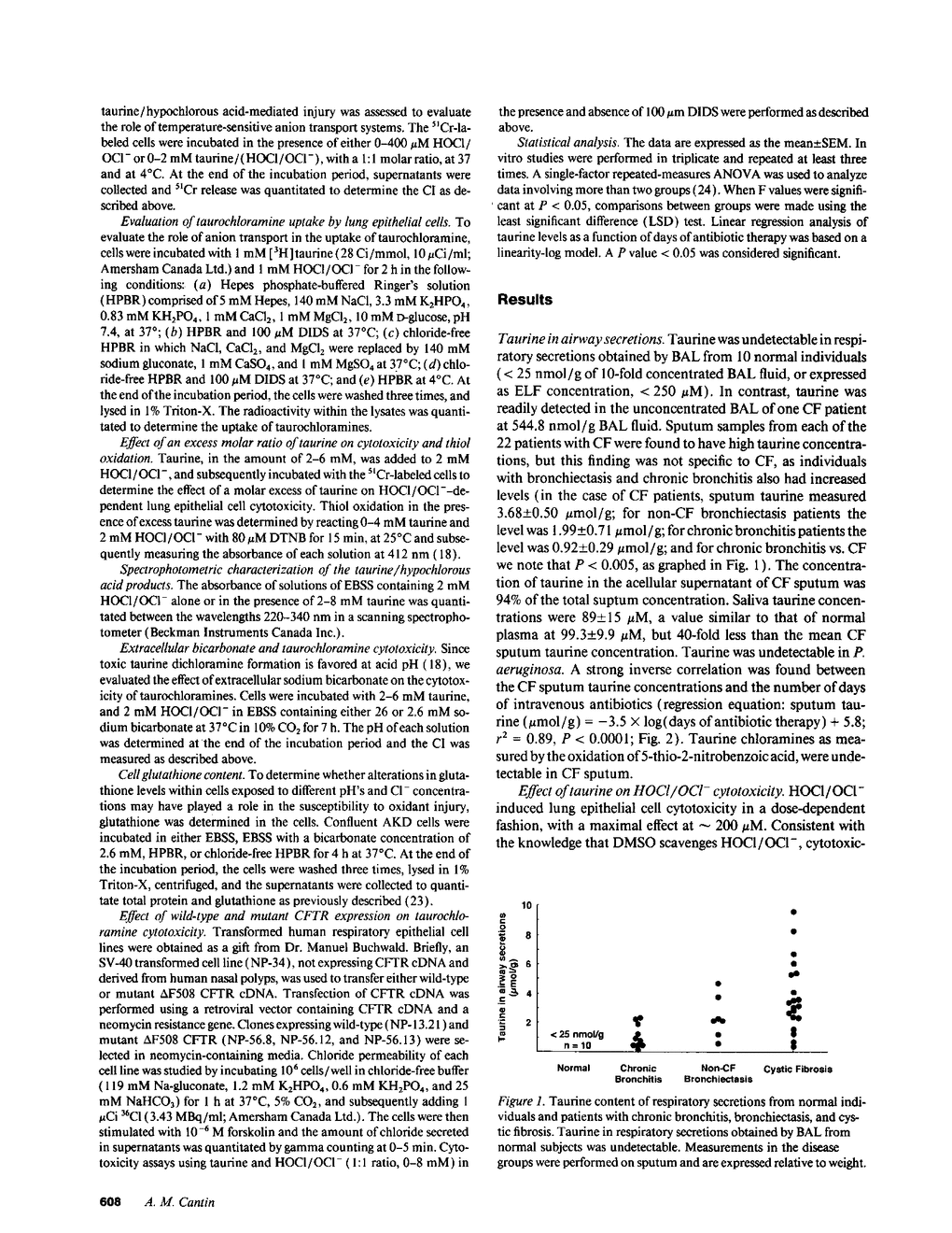 Airway secretions of cystic fibrosis patients were found to contain high concentrations of taurine, which decreased with antibiotic therapy during acute respiratory exacerbations. Taurine, in a 1:1 molar ratio with HOCl/OCl-, caused a 10-fold increase in the amount of HOCl/OCl- needed to induce cytotoxicity to the cat lung epithelial cell line, AKD. Although DMSO protected cells against HOCl/OCl(-)-mediated injury, the presence of an equimolar concentration of taurine with HOCl/OCl- prevented DMSO from protecting cells and sulfhydryl groups against oxidation, suggesting the formation of taurine chloramines. Spectral properties confirmed the formation of monochloramines and dichloramines. Chloride-free buffer, DIDS, and low temperature (4 degrees C) each protected the cells against taurine/HOCl/OCl-, indicating that taurine chloramine uptake through anion transport pathways was required to induce cytotoxicity. A molar excess of taurine inhibited cytotoxicity, to induce cytotoxicity. A molar excess of taurine inhibited cytotoxicity, by decreasing taurine dichloramines and increasing the formation of less toxic taurine monochloramines. We conclude that taurine can protect lung epithelial cells by converting HOCl/OCl- to anionic monochloramines, but that taurine dichloramines can be toxic to respiratory epithelial cells through mechanisms that depend upon epithelial cell anion transport.