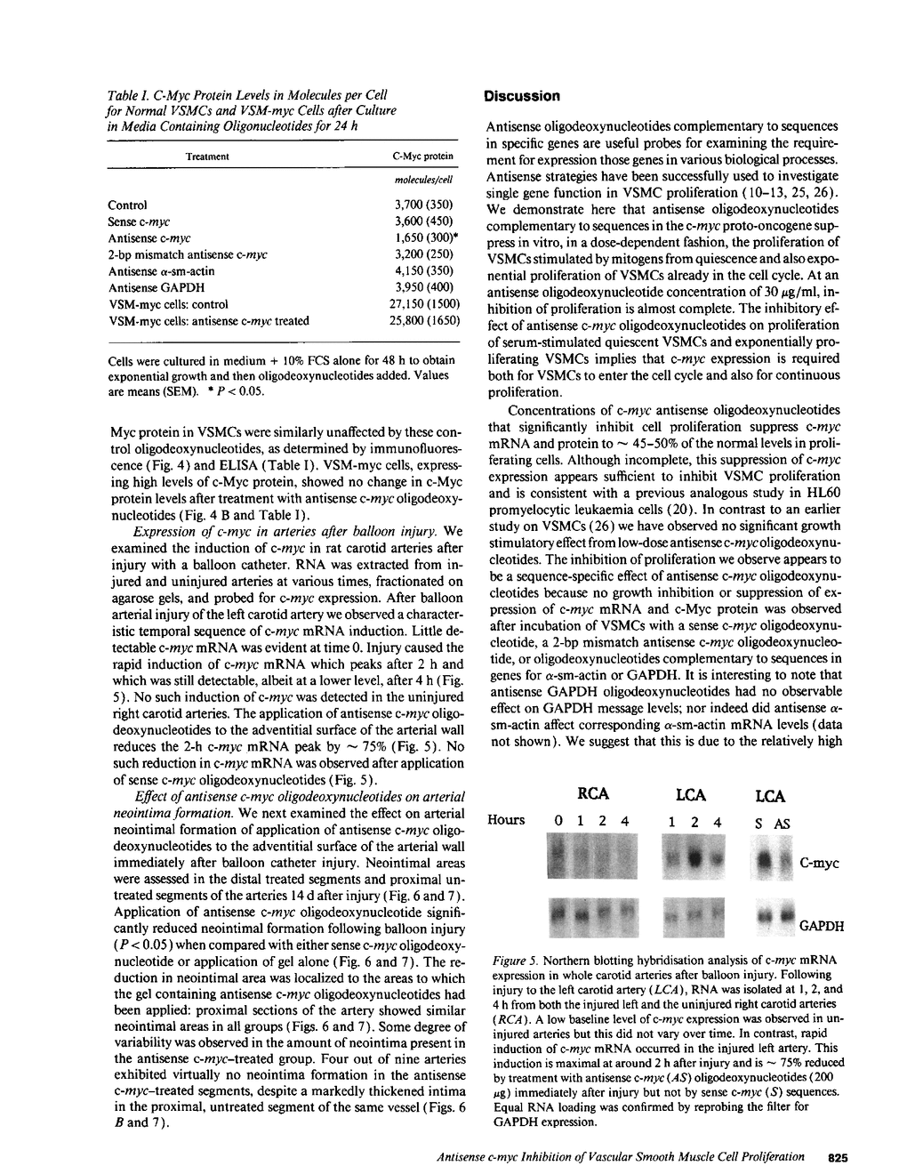 Restenosis after angioplasty is due predominantly to accumulation of vascular smooth muscle cells (VSMCs). The resistance of restenosis to pharmacological treatment has prompted investigation of genes involved in VSMC proliferation. We have examined the effect on VSMC proliferation of blocking expression of the c-myc proto-oncogene with antisense oligodeoxynucleotides, both in vitro and in a rat carotid artery injury model of angioplasty restenosis. Antisense c-myc oligodeoxynucleotides reduced average cell levels of c-myc mRNA and protein by 50-55% and inhibited proliferation of VSMCs when mitogenically stimulated from quiescence or when proliferating logarithmically (IC50 = 10 micrograms/ml). Corresponding sense c-myc, two-base-pair mismatch antisense c-myc, antisense alpha-actin or glyceraldehyde phosphate dehydrogenase oligodeoxynucleotides did not suppress c-myc expression or inhibit VSMC proliferation. Antisense c-myc inhibition was relieved by overexpression of an exogenous c-myc gene. After balloon catheter injury, peak c-myc mRNA expression occurred at 2 h. Antisense c-myc applied in a pluronic gel to the arterial adventitia reduced peak c-myc expression by 75% and significantly reduced neointimal formation at 14 d, compared with sense c-myc and gel application alone. We conclude that c-myc expression is required for VSMC proliferation in vitro and in the vessel wall. C-myc is a therefore a potential target for adjunctive therapy to reduce angioplasty restenosis.