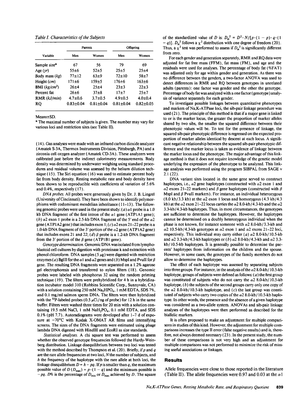 The aim of this study was to investigate in 261 subjects from 58 families the association between DNA variation at the genes coding for the Na,K-ATPase peptides and resting metabolic rate (RMR), respiratory quotient (RQ), and percent body fat (%FAT). Five restriction fragment length polymorphisms (RFLP) at three Na,K-ATPase genes were determined: one at the alpha 1 locus (BglII), and two at the beta locus (beta MspI and beta PvuII). Haplotypes were determined from the two variable sites of the alpha 2 gene (alpha 2 haplotypes) and the beta gene (beta haplotypes). There was a strong trend for %FAT to be related to the RFLP generated by BglII at the alpha 2 exons 21-22 in males (P = 0.06) and females (P = 0.05). RQ was (a) associated with the BglII RFLP at the alpha 2 exon 1 (P = 0.02) and with the alpha 2 8.0 kb/4.3 kb haplotype (P = 0.04) and (b) linked with the beta gene MspI marker (P = 0.04) and with the beta 5.3 kb/5.1 kb haplotype (P = 0.008) based on sib-pair analysis. The present study suggests that the genes encoding Na,K-ATPase may be associated or linked with RQ and perhaps with %FAT but not with RMR.