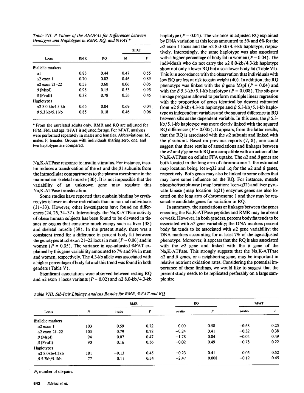 The aim of this study was to investigate in 261 subjects from 58 families the association between DNA variation at the genes coding for the Na,K-ATPase peptides and resting metabolic rate (RMR), respiratory quotient (RQ), and percent body fat (%FAT). Five restriction fragment length polymorphisms (RFLP) at three Na,K-ATPase genes were determined: one at the alpha 1 locus (BglII), and two at the beta locus (beta MspI and beta PvuII). Haplotypes were determined from the two variable sites of the alpha 2 gene (alpha 2 haplotypes) and the beta gene (beta haplotypes). There was a strong trend for %FAT to be related to the RFLP generated by BglII at the alpha 2 exons 21-22 in males (P = 0.06) and females (P = 0.05). RQ was (a) associated with the BglII RFLP at the alpha 2 exon 1 (P = 0.02) and with the alpha 2 8.0 kb/4.3 kb haplotype (P = 0.04) and (b) linked with the beta gene MspI marker (P = 0.04) and with the beta 5.3 kb/5.1 kb haplotype (P = 0.008) based on sib-pair analysis. The present study suggests that the genes encoding Na,K-ATPase may be associated or linked with RQ and perhaps with %FAT but not with RMR.