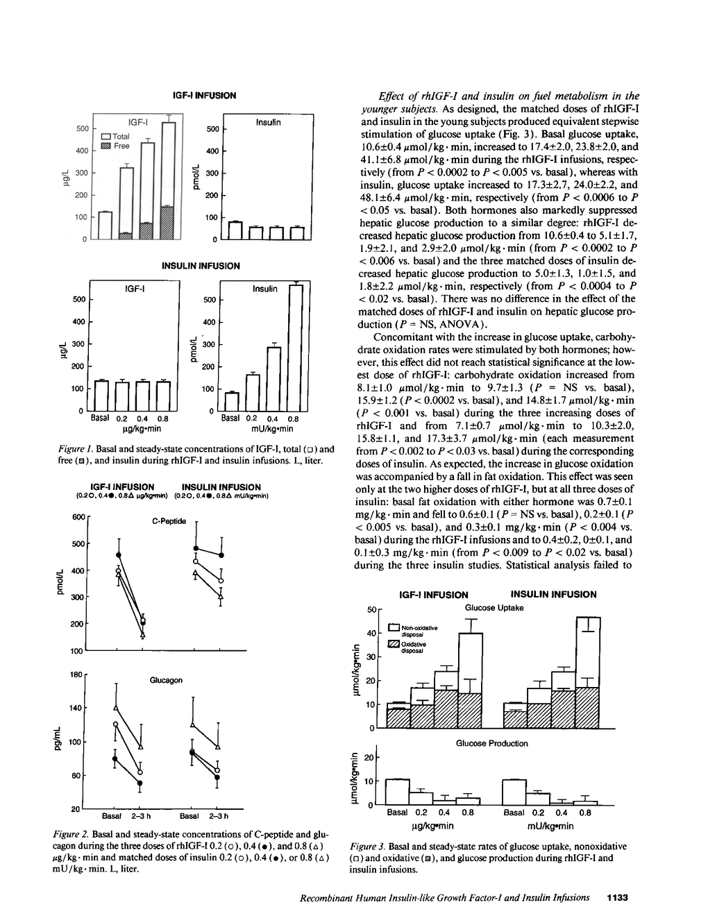 The actions of recombinant human insulin-like growth factor-I (rhIGF-I) and insulin were compared in 21 healthy young (24 +/- 1 yr) and 14 healthy middle-aged (48 +/- 2 yr) subjects during 3-h paired euglycemic clamp studies using one of three doses (rhIGF-I 0.2, 0.4, and 0.8 micrograms/kg.min and insulin 0.2, 0.4, and 0.8 mU/kg.min, doses chosen to produce equivalent increases in glucose uptake). In younger subjects, rhIGF-I infusions suppressed insulin by 19-33%, C-peptide by 47-59% and glucagon by 33-47% (all, P < 0.02). The suppression of C-peptide was less pronounced with insulin than with rhIGF-I (P < 0.007). The metabolic responses to rhIGF-I and insulin were remarkably similar: not only did both hormones increase glucose uptake and oxidation in a nearly identical fashion, but they also produced similar suppression of glucose production, free fatty acid levels, and fat oxidation rates. In contrast, rhIGF-I had a more pronounced amino acid-lowering effect than did insulin (P < 0.004). In middle-aged subjects, basal IGF-I levels were 44% lower (P < 0.0001) whereas basal insulin and C-peptide were 20-25% higher than in younger subjects. Age did not alter the response to rhIGF-I. However, insulin-induced stimulation of glucose uptake was blunted in older subjects (P = 0.05). Our data suggest that absolute IGF-I and relative insulin deficiency contribute to adverse metabolic changes seen in middle age.