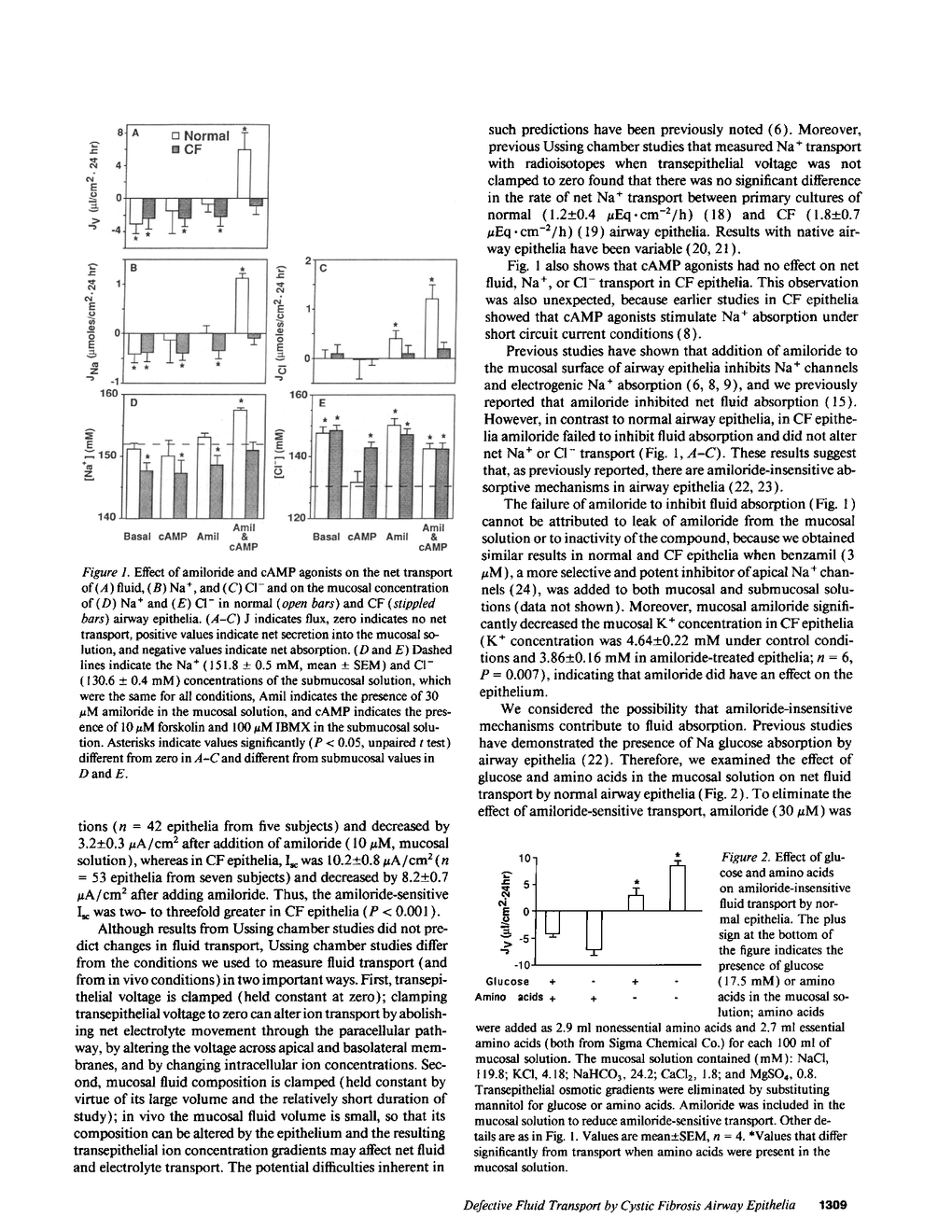 Cystic fibrosis (CF) airway epithelia exhibit defective transepithelial electrolyte transport: cAMP-stimulated Cl- secretion is abolished because of the loss of apical membrane cystic fibrosis transmembrane conductance regulator (CFTR) Cl- channels, and amiloride-sensitive Na+ absorption is increased two- to threefold because of increased amiloride-sensitive apical Na+ permeability. These abnormalities are thought to alter respiratory tract fluid, thereby contributing to airway disease, the major source of mortality in this genetic disease. However, the underlying hypothesis, that fluid transport is abnormal in CF airway epithelia, has not been tested. Most conjecture about fluid transport is based on measurements of Na+ and Cl- transport performed under short circuit conditions in Ussing chambers. But such studies differ from in vivo conditions in that transepithelial voltage and mucosal fluid composition are held constant. Therefore, we measured fluid transport and mucosal electrolyte composition in primary cultures of CF airway epithelia without holding transepithelial voltage and ion concentration gradients at zero. In normal epithelia, cAMP agonists plus amiloride stimulated NaCl and fluid secretion. In CF epithelia, cAMP agonists failed to stimulate fluid or electrolyte secretion, changes consistent with the loss of CFTR Cl- channels. But in striking contrast to predictions based on Ussing chamber studies, CF epithelia absorbed fluid at a rate no greater than normal epithelia. Moreover, amiloride, which inhibits Na+ channels, failed to inhibit fluid absorption by CF epithelia. These results have important implications for understanding the pathogenesis of CF airway disease and for the design and evaluation of therapy.