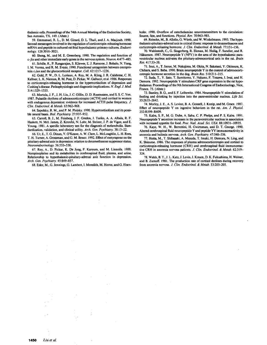 Studies were performed to determine the effects of intracerebroventricular norepinephrine (NE) or neuropeptide Y (NPY) on the ovine hypothalamic-pituitary-adrenal (HPA) axis. NE (50 micrograms) increased mean hypophysial-portal corticotropin-releasing factor (CRF) and arginine vasopressin (AVP) levels (1 h, 1.3- and 2.9-fold; 4 h, 2.2- and 5.7-fold) and caused acute and sustained increases in mean plasma ACTH and cortisol. NPY (50 microgram) also increased mean CRF and AVP levels (1 h, 1.4- and 4.2-fold; 4 h, 1.1- and 1.9-fold), increased pituitary-adrenal activity at 1 h, and caused ACTH hypersecretion at 4 h. When added to cultured ovine anterior pituitary cells, NPY neither increased basal ACTH release nor augmented CRF- or AVP-induced ACTH release. We conclude that: (a) activation of either the central noradrenergic or NPY pathways causes an acute and sustained stimulation of the ovine HPA axis; (b) such activation increases the AVP/CRF ratio, suggesting a dominant role for AVP in the ovine stress response; and (c) the central noradrenergic or NPY systems may cause sustained HPA activation by attenuating or disrupting the glucocorticoid negative feedback on those brain areas concerned with regulation of the HPA axis. The possible roles of the central noradrenergic and NPY systems in the etiology of the hypercortisolemia of endogenous depression and anorexia nervosa are discussed.