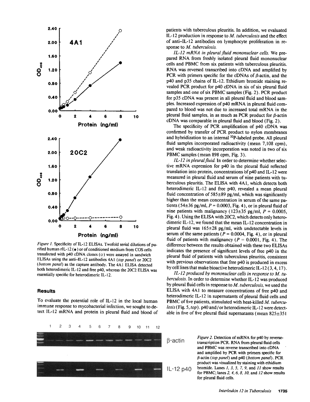 Interleukin 12 (IL-12), a heterodimeric cytokine composed of p40 and p35 chains, has potent immunologic effects in vitro. We used tuberculous pleuritis as a model to study the immunoregulatory potential of IL-12 in vivo at the site of human infectious disease. Messenger RNAs for p40 and p35 were detected in pleural fluid from six of six patients by reverse-transcription polymerase chain reaction. By using an ELISA that detected both free p40 and heterodimeric IL-12, we found that mean concentrations were 585 +/- 89 pg/ml in pleural fluid of patients with tuberculous pleuritis, which were significantly higher than those in serum of the same patients (54 +/- 36 pg/ml), or in malignant pleural effusions (123 +/- 35 pg/ml). By using an ELISA specific for heterodimeric IL-12, we found that mean concentrations in pleural fluid of patients with tuberculous pleuritis were 165 +/- 28 pg/ml and undetectable in serum of the same patients, or in malignant pleural effusions. Bioactive IL-12 was detectable in five of five supernatants of pleural fluid cells stimulated with Mycobacterium tuberculosis. Addition of anti-IL-12 antibodies suppressed proliferative responses of pleural fluid cells to M. tuberculosis by 36 +/- 7%. These data indicate that IL-12 may play a role in the human immune response to infectious agents in vivo. We hypothesize that IL-12 contributes to the antimycobacterial immune response by enhancing production of interferon-gamma, facilitating development of Th1 cells and augmenting cytotoxicity of antigen-specific T cells and natural killer cells.
