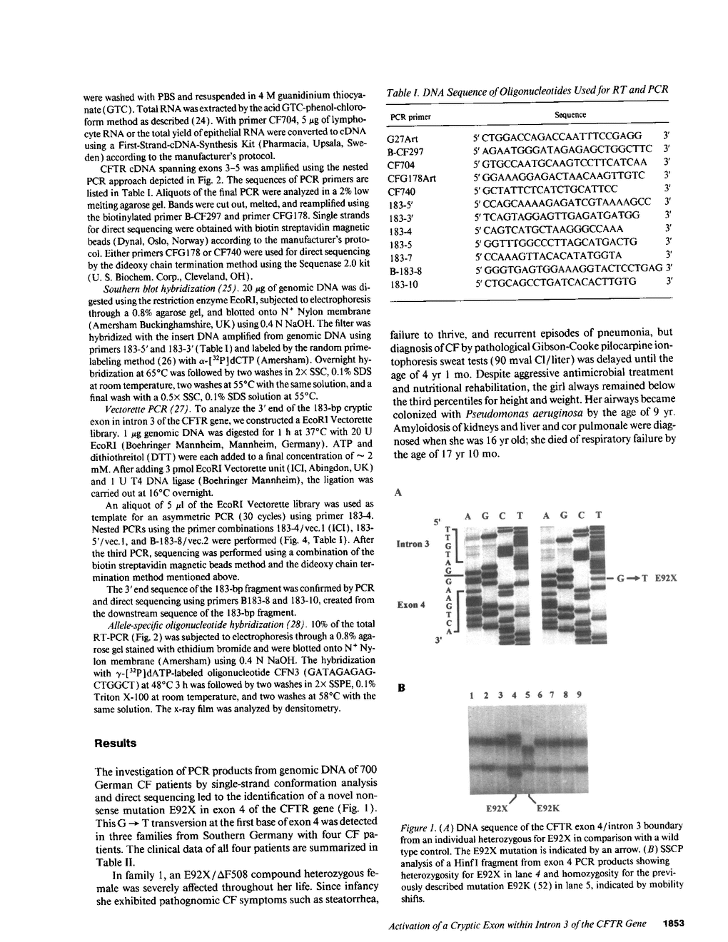 Cystic fibrosis (CF) is caused by mutations in the cystic fibrosis transmembrane conductance regulator (CFTR) gene. We report on a novel nonsense mutation that leads to exon skipping and the activation of a cryptic exon. Screening of genomic DNA from 700 German patients with CF uncovered four cases with the nonsense mutation E92X, a G-->T transversion that creates a termination codon and affects the first base of exon 4 of the CFTR gene. Lymphocyte RNA of two CF patients heterozygous for E92X was found to contain the wild type sequence and a differentially spliced isoform lacking exon 4. In RNA derived from nasal epithelial cells of E92X patients, a third fragment of longer size was observed. Sequencing revealed the presence of E92X and an additional 183-bp fragment, inserted between exons 3 and 4. The 183-bp sequence was mapped to intron 3 of the CFTR gene. It is flanked by acceptor and donor splice sites. We conclude that the 183-bp fragment in intron 3 is a cryptic CFTR exon that can be activated in epithelial cells by the presence of the E92X mutation. E92X abolishes correctly spliced CFTR mRNA and leads to severe cystic fibrosis.