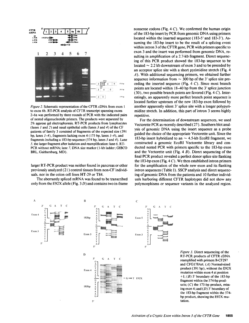 Cystic fibrosis (CF) is caused by mutations in the cystic fibrosis transmembrane conductance regulator (CFTR) gene. We report on a novel nonsense mutation that leads to exon skipping and the activation of a cryptic exon. Screening of genomic DNA from 700 German patients with CF uncovered four cases with the nonsense mutation E92X, a G-->T transversion that creates a termination codon and affects the first base of exon 4 of the CFTR gene. Lymphocyte RNA of two CF patients heterozygous for E92X was found to contain the wild type sequence and a differentially spliced isoform lacking exon 4. In RNA derived from nasal epithelial cells of E92X patients, a third fragment of longer size was observed. Sequencing revealed the presence of E92X and an additional 183-bp fragment, inserted between exons 3 and 4. The 183-bp sequence was mapped to intron 3 of the CFTR gene. It is flanked by acceptor and donor splice sites. We conclude that the 183-bp fragment in intron 3 is a cryptic CFTR exon that can be activated in epithelial cells by the presence of the E92X mutation. E92X abolishes correctly spliced CFTR mRNA and leads to severe cystic fibrosis.