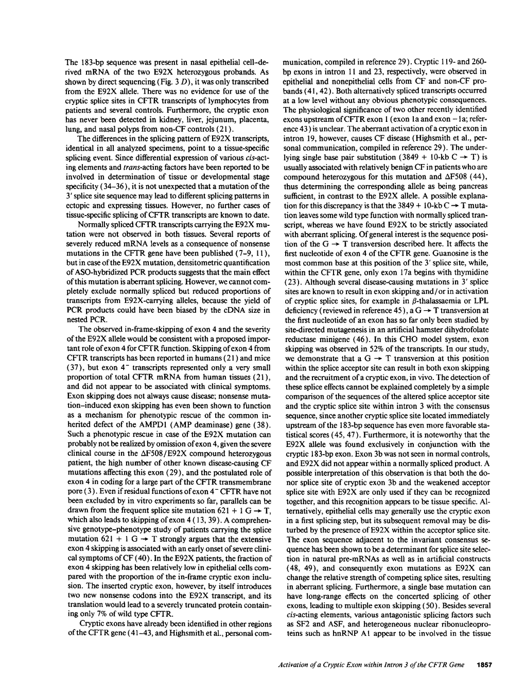 Cystic fibrosis (CF) is caused by mutations in the cystic fibrosis transmembrane conductance regulator (CFTR) gene. We report on a novel nonsense mutation that leads to exon skipping and the activation of a cryptic exon. Screening of genomic DNA from 700 German patients with CF uncovered four cases with the nonsense mutation E92X, a G-->T transversion that creates a termination codon and affects the first base of exon 4 of the CFTR gene. Lymphocyte RNA of two CF patients heterozygous for E92X was found to contain the wild type sequence and a differentially spliced isoform lacking exon 4. In RNA derived from nasal epithelial cells of E92X patients, a third fragment of longer size was observed. Sequencing revealed the presence of E92X and an additional 183-bp fragment, inserted between exons 3 and 4. The 183-bp sequence was mapped to intron 3 of the CFTR gene. It is flanked by acceptor and donor splice sites. We conclude that the 183-bp fragment in intron 3 is a cryptic CFTR exon that can be activated in epithelial cells by the presence of the E92X mutation. E92X abolishes correctly spliced CFTR mRNA and leads to severe cystic fibrosis.