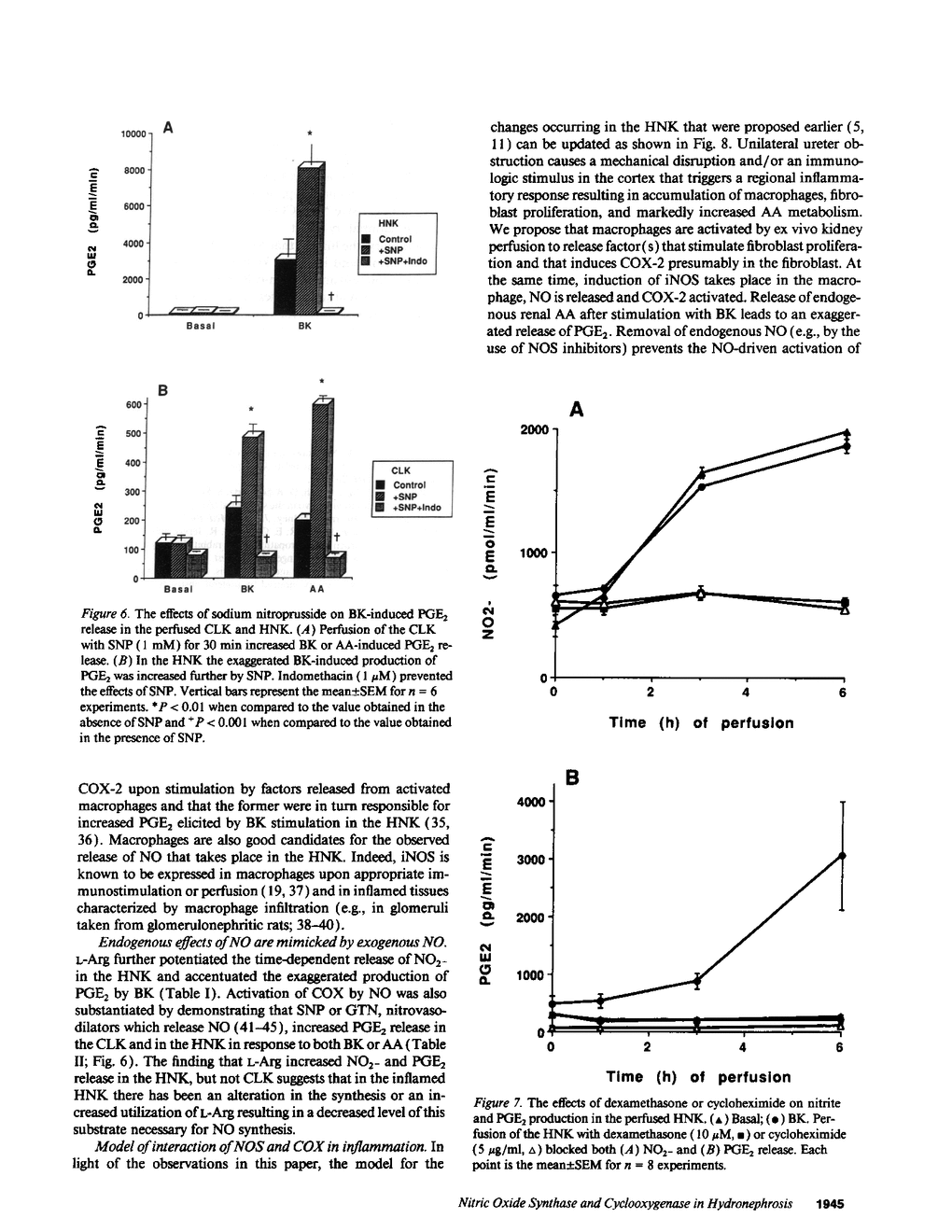 The interaction between nitric oxide (NO) and cyclooxygenase (COX) was studied in a rabbit model of renal inflammation, the ureteral obstructed hydronephrotic kidney (HNK). Ex vivo perfusion of the HNK but not the control kidney (e.g., unobstructed contralateral kidney, CLK), led to a time-dependent release of nitrite (NO2-), a breakdown product of NO. Stimulation of the HNK with bradykinin (BK) evoked a time-dependent increase in prostaglandin E2 (PGE2) production. NG-monomethyl-L-arginine (L-NMMA), which blocks the activity of both constitutive and inducible nitric oxide synthase (cNOS and iNOS), aminoguanidine, a recently described selective iNOS inhibitor, dexamethasone, or cycloheximide abolished the release of NO2- and attenuated the exaggerated BK-induced PGE2 production. This supports the existence of iNOS and COX-2 in the HNK. In the CLK, BK elicited release of both NO2- and PGE2 but this did not augment with time. L-NMMA but not aminoguanidine, dexamethasone, or cycloheximide attenuated NO2- and PGE2 release indicative of the presence of constitutive but not inducible NOS or COX. The current study suggests that the endogenous release of NO from cNOS in the CLK activates a constitutive COX resulting in optimal PGE2 release by BK. In addition, in the HNK, NO release from iNOS activates the induced COX resulting in markedly increased release of proinflammatory prostaglandin. The broader implication of this study is that the cyclooxygenase isozymes are potential receptor targets for nitric oxide.