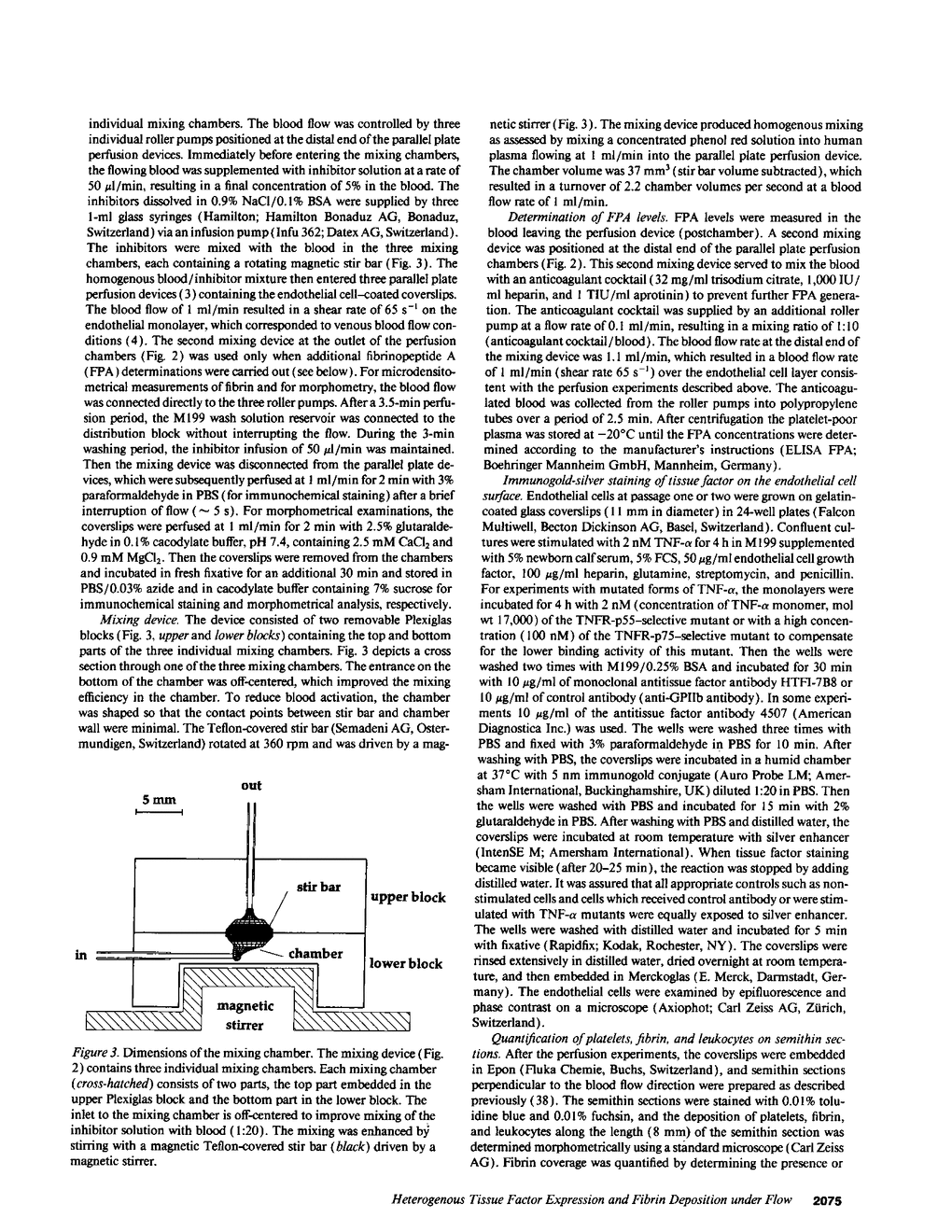 TNF-alpha induces changes in endothelial cell functions, such as upregulation of tissue factor, resulting in endothelial procoagulant activity which may play a role in disseminated intravascular coagulation. The procoagulant activity of TNF-alpha-stimulated endothelial cell monolayers was studied in a human ex vivo native (nonanticoagulated) blood flow system using the three thrombin inhibitors recombinant hirudin, Ro 46-6240, and heparin. Under venous blood flow conditions (shear rate 65 s-1) recombinant hirudin, Ro 46-6240, and heparin inhibited fibrin deposition on the endothelial cells by 50% at concentrations of 14, 28, and 412 ng/ml, respectively. The highest tested concentrations of the thrombin inhibitors reduced the postchamber fibrinopeptide A levels from 713 +/- 69 to < 70 ng/ml. Surprisingly, even at relatively high inhibitor concentrations, some local fibrin deposits were found on TNF-alpha-stimulated cells, suggesting that some endothelial cells possess higher procoagulant activity than others. Therefore, the surface expression pattern of tissue factor, the primary initiator of coagulation in this system, was examined by immunogold-silver staining. The results showed that the tissue factor density on the cell surface varied strongly among TNF-alpha-stimulated endothelial cells. Using TNF receptor-selective agonistic mutants of TNF-alpha, it was demonstrated further that the heterogenous surface expression of tissue factor was mediated entirely by the 55-kD TNF receptor and did not involve the 75-kD TNF receptor. We conclude that in this system TNF-alpha induces heterogenous tissue factor expression which may lead to a high local thrombin concentration, such that even in the presence of thrombin inhibitors focal fibrin deposition occurs.