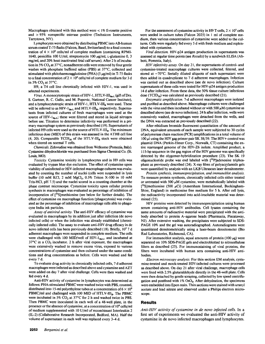 We have investigated the effects of cystamine on the replication of human immunodeficiency virus (HIV) in human lymphocytes and macrophages, the natural targets of HIV in vivo. Treatment of chronically infected macrophages with cystamine, at a concentration (500 microM) that did not show any cytotoxic or cytostatic effects, strongly decreased (> 80%) HIV-p24 antigen production and completely abolished the production of infectious viral particles. Cystamine does not affect viral transcription, translation or protein processing; indeed, all HIV proteins are present in a pattern similar to that of nontreated cells. Instead, cystamine interferes with the orderly assembly of HIV virions, as shown by electron microscopy analysis, that reveals only defective viral particles in treated cells. Moreover, suppression of HIV replication, due to the inhibition of proviral DNA formation was observed in acutely infected lymphocytes and macrophages pretreated with cystamine. These results show that cystamine potently suppresses HIV replication in human cells by contemporaneously blocking at least two independent steps of the viral life cycle, without affecting cell viability, suggesting that this compound may represent a new possibility towards the treatment of HIV-1 infection.