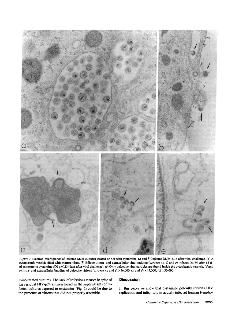 We have investigated the effects of cystamine on the replication of human immunodeficiency virus (HIV) in human lymphocytes and macrophages, the natural targets of HIV in vivo. Treatment of chronically infected macrophages with cystamine, at a concentration (500 microM) that did not show any cytotoxic or cytostatic effects, strongly decreased (> 80%) HIV-p24 antigen production and completely abolished the production of infectious viral particles. Cystamine does not affect viral transcription, translation or protein processing; indeed, all HIV proteins are present in a pattern similar to that of nontreated cells. Instead, cystamine interferes with the orderly assembly of HIV virions, as shown by electron microscopy analysis, that reveals only defective viral particles in treated cells. Moreover, suppression of HIV replication, due to the inhibition of proviral DNA formation was observed in acutely infected lymphocytes and macrophages pretreated with cystamine. These results show that cystamine potently suppresses HIV replication in human cells by contemporaneously blocking at least two independent steps of the viral life cycle, without affecting cell viability, suggesting that this compound may represent a new possibility towards the treatment of HIV-1 infection.