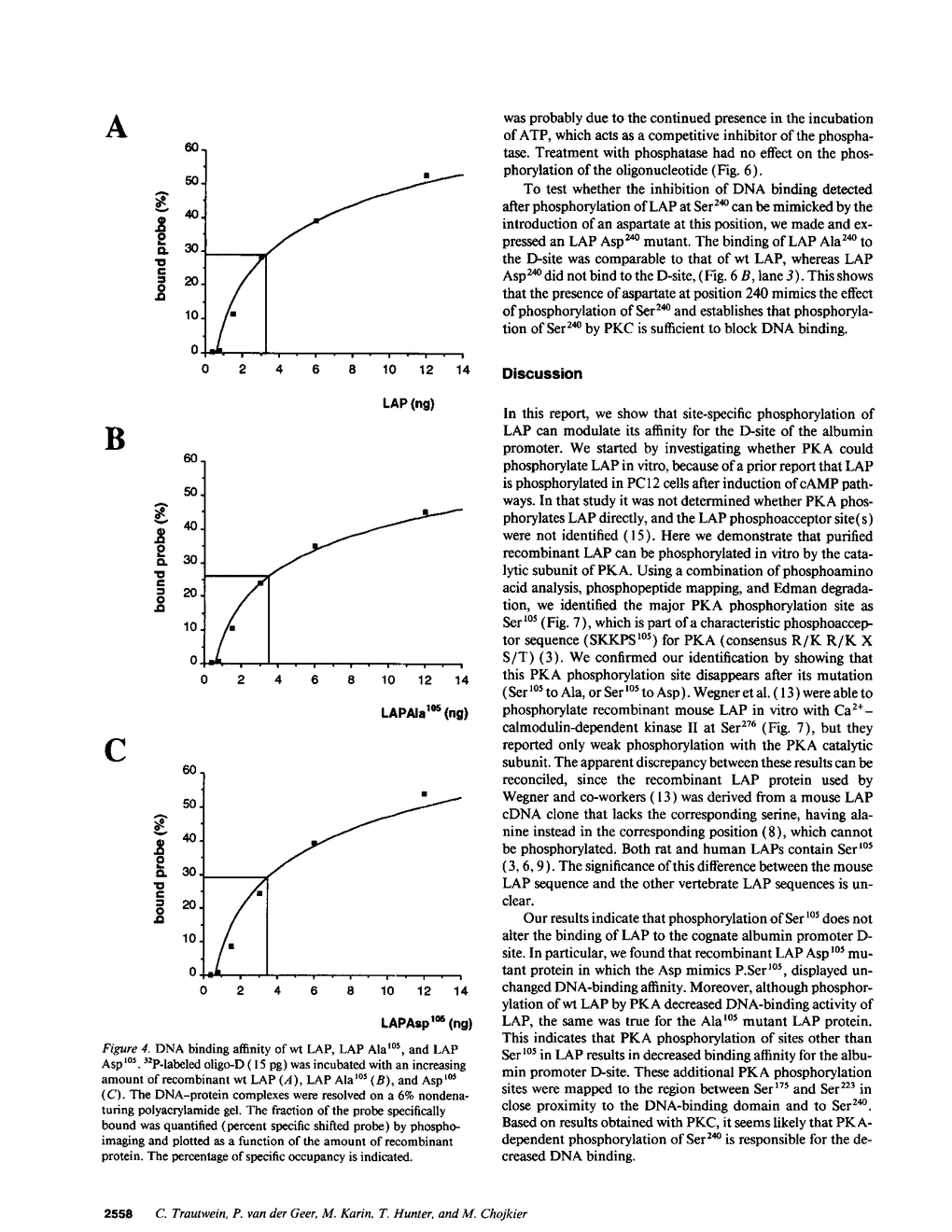 LAP (NF-IL6 or C/EBP beta), is a liver transcriptional activator protein that confers liver-specific gene expression. Because LAP has a characteristic phosphoacceptor sequence for cAMP-dependent protein kinase A (PKA), we tested if in vitro phosphorylation of LAP by PKA modulates its interaction with specific DNA sequences. The major PKA phosphorylation site of LAP was identified as Ser105, which is a predicted PKA site. As expected, this PKA phosphorylation site disappears after mutation of Ser105 to Ala. Kinetic studies with LAP and LAP Asp105 (which mimics a phosphoserine residue) demonstrated that phosphorylation of Ser105 itself has no effect on DNA binding. Phosphorylation of other sites by PKA, identified in the region between Ser173 and Ser223 and at Ser240, by analysis of truncated and mutated LAP peptides, resulted in an inhibition of DNA binding. LAP was also phosphorylated by purified protein kinase C in vitro, and the major phosphoacceptor was shown to be Ser240 within the DNA-binding domain of LAP. Phosphorylation of LAP at this residue or introduction of a Ser240 to Asp mutation resulted in marked decrease in its binding to DNA. These results suggest that site-specific phosphorylations of LAP modulate transactivation of its target genes.