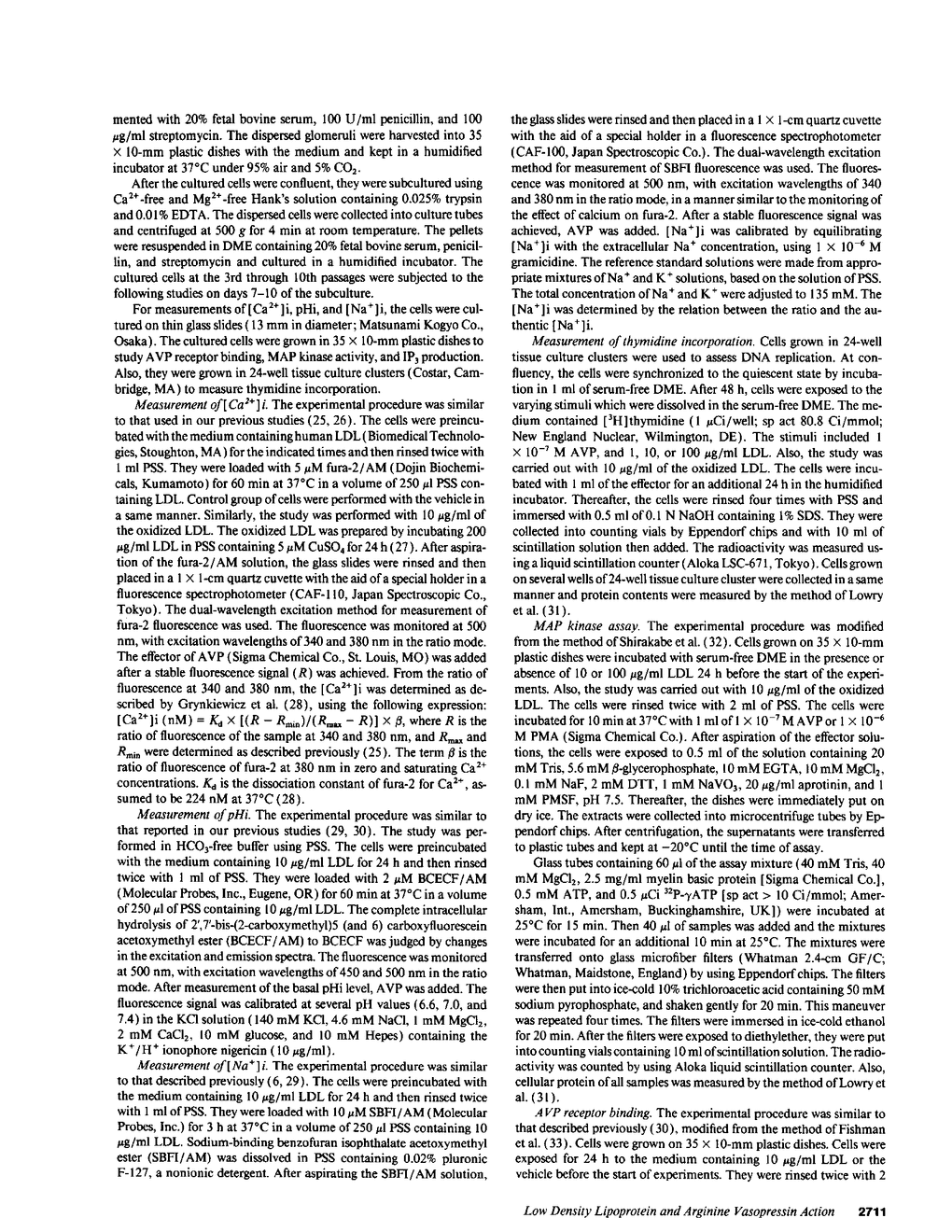 The present study was undertaken to determine whether low density lipoprotein (LDL) modulates the cellular action of arginine vasopressin (AVP) in rat glomerular mesangial cells in culture. AVP increased cellular free calcium ([Ca2+]i) in a dose-dependent manner. When cells were preincubated for 24 h with 10 microgram/ml LDL, the 1 x 10(-7) M AVP-mobilized [Ca2+]i was 874 nM, a value significantly greater than that of 375 nM in the intact cells. AVP caused a biphasic change in cellular pH (pHi), namely, an early acidification followed by a sustained alkalinization, and the change in pHi produced by AVP was also enhanced by LDL. AVP stimulated a 2.2-fold increase in [3H]thymidine incorporation, an effect significantly greater in the presence of 10 micrograms/ml LDL. Furthermore, 1 x 10(-7) M AVP significantly activated mitogen-activated protein kinase from 14.0 to 24.5 pmol/mg protein. Such an activation was significantly enhanced by the LDL pretreatment. Both [3H]thymide incorporation and mitogen-activated protein kinase were not altered by 10 micrograms/ml LDL. [3H]AVP receptor binding was not affected by the LDL pretreatment. 1 x 10(-7) M AVP increased inositol trisphosphate production by 1.9-fold, an effect significantly greater in the presence of LDL. These results indicate that LDL enhances the cellular action of AVP and the AVP-stimulated cellular proliferation in glomerular mesangial cells. A site of action of LDL is the hydrolysis of phosphatidylinositol.
