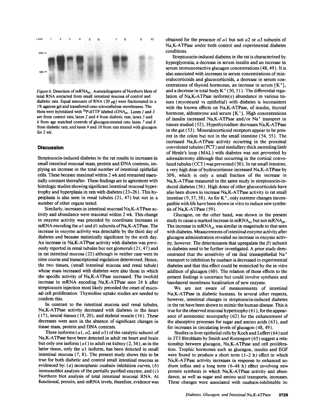 Na,K-ATPase activity and isoform expression were measured in rat small intestinal mucosa taken from both normal and streptozocin-treated diabetic rats. Enzyme activity and abundance was 1.7-2.3-fold higher in rats diabetic for 2 wk than in controls. This was associated with 1.4-1.7-fold increases in small intestinal protein and DNA content. Ouabain inhibition curves of Na,K-ATPase were monophasic with Kis of 2.6 +/- 1.4 x 10(-4) and 2.0 +/- 1.2 x 10(-4) M for control and diabetic rats, respectively (NS). Northern blot analysis revealed a 2.5-fold increase in mRNA alpha 1 and a 3.4-fold increase in mRNA beta 1 in diabetic rats relative to controls. Two thirds of this increase occurred within 24h after injection of streptozocin. Immunoblots of intestinal enzyme preparations from diabetic and control rats indicated the presence of alpha 1 and beta 1 subunits but not of alpha 2 or alpha 3. Administration of glucagon (80 micrograms/kg) to normal rats daily for 14-16 d increased mRNA alpha 1 3.1-fold but did not increase mRNA beta 1 or enzyme activity. In experimental diabetes, alpha 1 and beta 1 isoforms of Na,K-ATPase are coordinately upregulated at both protein and mRNA levels, an effect which appears to be partially mediated by the associated hyperglucagonemia.