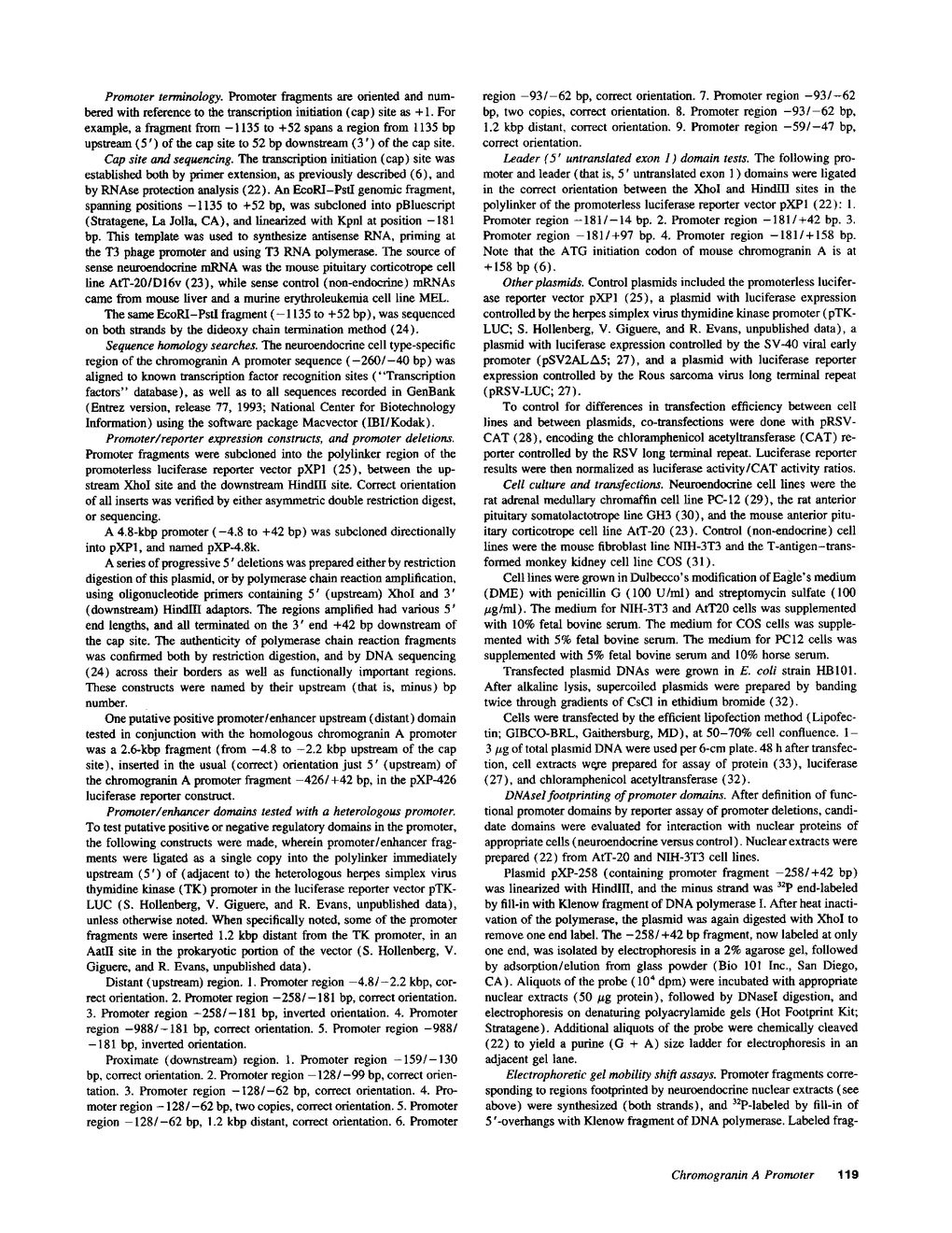 The acidic secretory protein chromogranin A universally occurs in amine and peptide hormone and neurotransmitter storage granules throughout the neuroendocrine system. What factors govern the activity of the chromogranin A gene, to yield such a widespread yet neuroendocrine-selective pattern of expression? To address this question, we isolated the mouse chromogranin A gene promoter. The promoter conferred cell type-specific expression in several neuroendocrine cell types (adrenal medullary chromaffin cells, anterior pituitary corticotropes, and anterior pituitary somatolactotropes) but not in control (fibroblast or kidney) cells. In neuroendocrine cells, analysis of promoter deletions established both positive and negative transcriptional regulatory domains. A distal positive domain (-4.8/-2.2 kbp) was discovered, as well as negative (-258/-181 bp) and positive (-147/-61 bp) domains in the proximate promoter. The proximate promoter contained a minimal neuroendocrine-specific element between -77 and -61 bp. Sequence alignment of the mouse promoter with corresponding regions in rat and bovine clones indicated that the mouse sequence shares over 85% homology with rat and 52% with bovine promoters. DNaseI footprinting and electrophoretic gel mobility shift assays demonstrated the presence of nuclear factors in neuroendocrine cells that recognized the proximate promoter. We conclude that the chromogranin A promoter contains both positive and negative domains governing its cell type-specific pattern of transcription, and that a small proximate region of the promoter, containing novel as well as previously described elements, interacts specifically with neuroendocrine nuclear proteins, and is thereby sufficient to ensure widespread neuroendocrine expression of the gene.