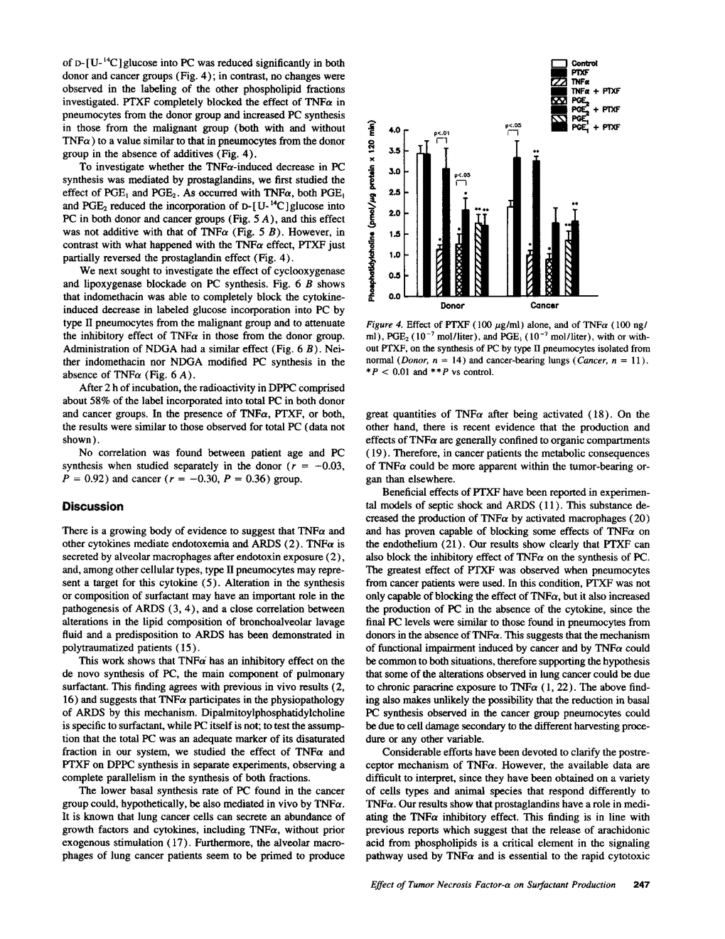 TNF alpha seems to play an important role in the pathogenesis of adult respiratory distress syndrome. We studied the effect of TNF alpha on phospholipid synthesis by isolated type II pneumocytes and attempted to characterize the role of arachidonate metabolites and the influence of pentoxifylline on such an effect. Lung tissue obtained from both multiple organ donors (n = 14) and lung cancer patients (n = 11) was used for cell isolation. Surfactant synthesis was measured by the incorporation of D-[U-14C]glucose into phosphatidylcholine (PC). The basal PC synthesis was higher in the donor group than in the malignant group (3.44 +/- 0.19 vs 2.15 +/- 0.15 pmol/microgram protein x 120 min, P < 0.01), and, in the presence of 100 ng/ml of TNF alpha, the incorporation of labeled glucose into PC was reduced significantly in both donor (1.13 +/- 0.11 vs 3.44 +/- 0.19 pmol/microgram protein x 120 min, P < 0.01) and cancer (0.99 +/- 0.11 vs 2.15 +/- 0.15 pmol/microgram protein x 120 min, P < 0.01) groups. Indomethacin was able to completely block the cytokine-induced decrease in PC synthesis by pneumocytes from the malignant group and to attenuate the inhibitory effect of TNF alpha in those from donors, nordihydroguaiaretic acid having a similar effect. The TNF alpha effect can be blocked by pentoxifylline (100 micrograms/ml), a substance which can even succeed in reverting the basal secretory inhibition of cancer patients' pneumocytes to levels similar to those of the donor group. TNF alpha may contribute to the pathophysiology of adult respiratory distress syndrome by inhibiting the synthesis of surfactant. TNF alpha might be produced in lung tumors, resulting in chronic paracrine or systemic exposure of pneumocytes to low concentrations of the cytokine. The TNF alpha effect was not prevented completely by the blockage of the arachidonic acid metabolism, hence other mediators should also be implicated.