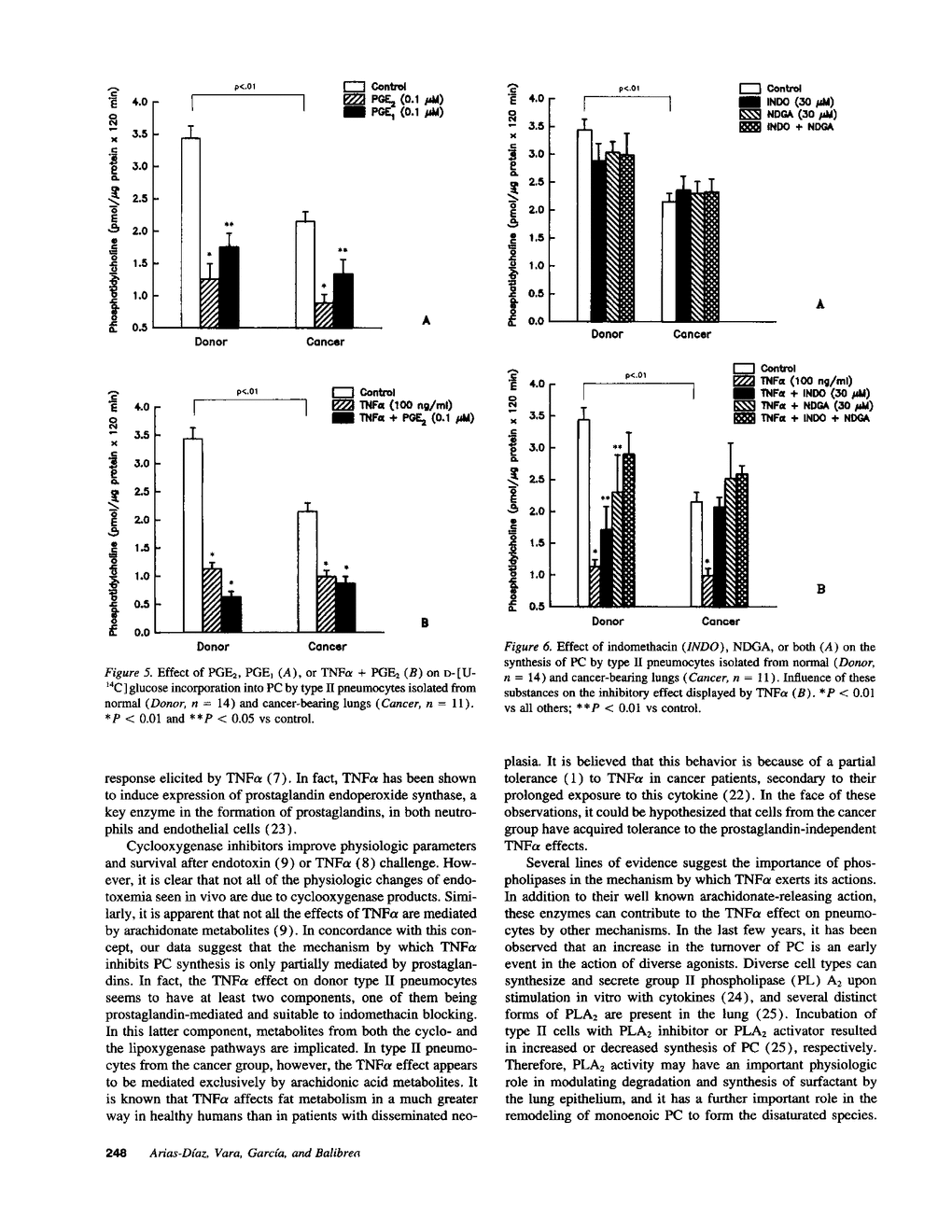 TNF alpha seems to play an important role in the pathogenesis of adult respiratory distress syndrome. We studied the effect of TNF alpha on phospholipid synthesis by isolated type II pneumocytes and attempted to characterize the role of arachidonate metabolites and the influence of pentoxifylline on such an effect. Lung tissue obtained from both multiple organ donors (n = 14) and lung cancer patients (n = 11) was used for cell isolation. Surfactant synthesis was measured by the incorporation of D-[U-14C]glucose into phosphatidylcholine (PC). The basal PC synthesis was higher in the donor group than in the malignant group (3.44 +/- 0.19 vs 2.15 +/- 0.15 pmol/microgram protein x 120 min, P < 0.01), and, in the presence of 100 ng/ml of TNF alpha, the incorporation of labeled glucose into PC was reduced significantly in both donor (1.13 +/- 0.11 vs 3.44 +/- 0.19 pmol/microgram protein x 120 min, P < 0.01) and cancer (0.99 +/- 0.11 vs 2.15 +/- 0.15 pmol/microgram protein x 120 min, P < 0.01) groups. Indomethacin was able to completely block the cytokine-induced decrease in PC synthesis by pneumocytes from the malignant group and to attenuate the inhibitory effect of TNF alpha in those from donors, nordihydroguaiaretic acid having a similar effect. The TNF alpha effect can be blocked by pentoxifylline (100 micrograms/ml), a substance which can even succeed in reverting the basal secretory inhibition of cancer patients' pneumocytes to levels similar to those of the donor group. TNF alpha may contribute to the pathophysiology of adult respiratory distress syndrome by inhibiting the synthesis of surfactant. TNF alpha might be produced in lung tumors, resulting in chronic paracrine or systemic exposure of pneumocytes to low concentrations of the cytokine. The TNF alpha effect was not prevented completely by the blockage of the arachidonic acid metabolism, hence other mediators should also be implicated.