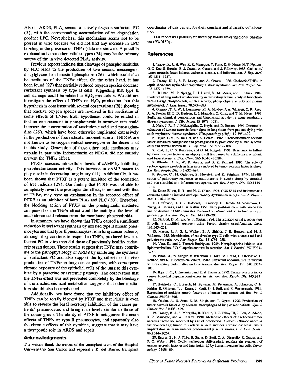 TNF alpha seems to play an important role in the pathogenesis of adult respiratory distress syndrome. We studied the effect of TNF alpha on phospholipid synthesis by isolated type II pneumocytes and attempted to characterize the role of arachidonate metabolites and the influence of pentoxifylline on such an effect. Lung tissue obtained from both multiple organ donors (n = 14) and lung cancer patients (n = 11) was used for cell isolation. Surfactant synthesis was measured by the incorporation of D-[U-14C]glucose into phosphatidylcholine (PC). The basal PC synthesis was higher in the donor group than in the malignant group (3.44 +/- 0.19 vs 2.15 +/- 0.15 pmol/microgram protein x 120 min, P < 0.01), and, in the presence of 100 ng/ml of TNF alpha, the incorporation of labeled glucose into PC was reduced significantly in both donor (1.13 +/- 0.11 vs 3.44 +/- 0.19 pmol/microgram protein x 120 min, P < 0.01) and cancer (0.99 +/- 0.11 vs 2.15 +/- 0.15 pmol/microgram protein x 120 min, P < 0.01) groups. Indomethacin was able to completely block the cytokine-induced decrease in PC synthesis by pneumocytes from the malignant group and to attenuate the inhibitory effect of TNF alpha in those from donors, nordihydroguaiaretic acid having a similar effect. The TNF alpha effect can be blocked by pentoxifylline (100 micrograms/ml), a substance which can even succeed in reverting the basal secretory inhibition of cancer patients' pneumocytes to levels similar to those of the donor group. TNF alpha may contribute to the pathophysiology of adult respiratory distress syndrome by inhibiting the synthesis of surfactant. TNF alpha might be produced in lung tumors, resulting in chronic paracrine or systemic exposure of pneumocytes to low concentrations of the cytokine. The TNF alpha effect was not prevented completely by the blockage of the arachidonic acid metabolism, hence other mediators should also be implicated.