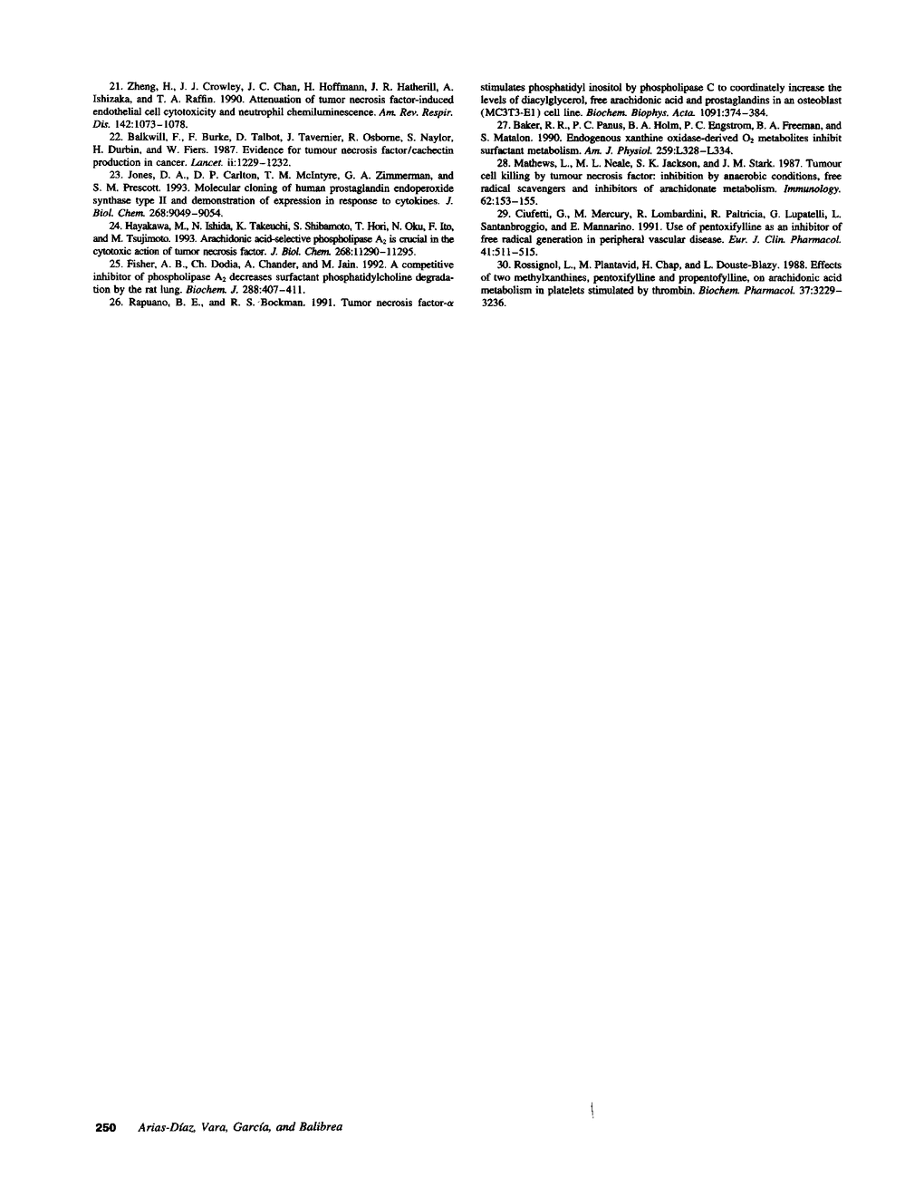 TNF alpha seems to play an important role in the pathogenesis of adult respiratory distress syndrome. We studied the effect of TNF alpha on phospholipid synthesis by isolated type II pneumocytes and attempted to characterize the role of arachidonate metabolites and the influence of pentoxifylline on such an effect. Lung tissue obtained from both multiple organ donors (n = 14) and lung cancer patients (n = 11) was used for cell isolation. Surfactant synthesis was measured by the incorporation of D-[U-14C]glucose into phosphatidylcholine (PC). The basal PC synthesis was higher in the donor group than in the malignant group (3.44 +/- 0.19 vs 2.15 +/- 0.15 pmol/microgram protein x 120 min, P < 0.01), and, in the presence of 100 ng/ml of TNF alpha, the incorporation of labeled glucose into PC was reduced significantly in both donor (1.13 +/- 0.11 vs 3.44 +/- 0.19 pmol/microgram protein x 120 min, P < 0.01) and cancer (0.99 +/- 0.11 vs 2.15 +/- 0.15 pmol/microgram protein x 120 min, P < 0.01) groups. Indomethacin was able to completely block the cytokine-induced decrease in PC synthesis by pneumocytes from the malignant group and to attenuate the inhibitory effect of TNF alpha in those from donors, nordihydroguaiaretic acid having a similar effect. The TNF alpha effect can be blocked by pentoxifylline (100 micrograms/ml), a substance which can even succeed in reverting the basal secretory inhibition of cancer patients' pneumocytes to levels similar to those of the donor group. TNF alpha may contribute to the pathophysiology of adult respiratory distress syndrome by inhibiting the synthesis of surfactant. TNF alpha might be produced in lung tumors, resulting in chronic paracrine or systemic exposure of pneumocytes to low concentrations of the cytokine. The TNF alpha effect was not prevented completely by the blockage of the arachidonic acid metabolism, hence other mediators should also be implicated.